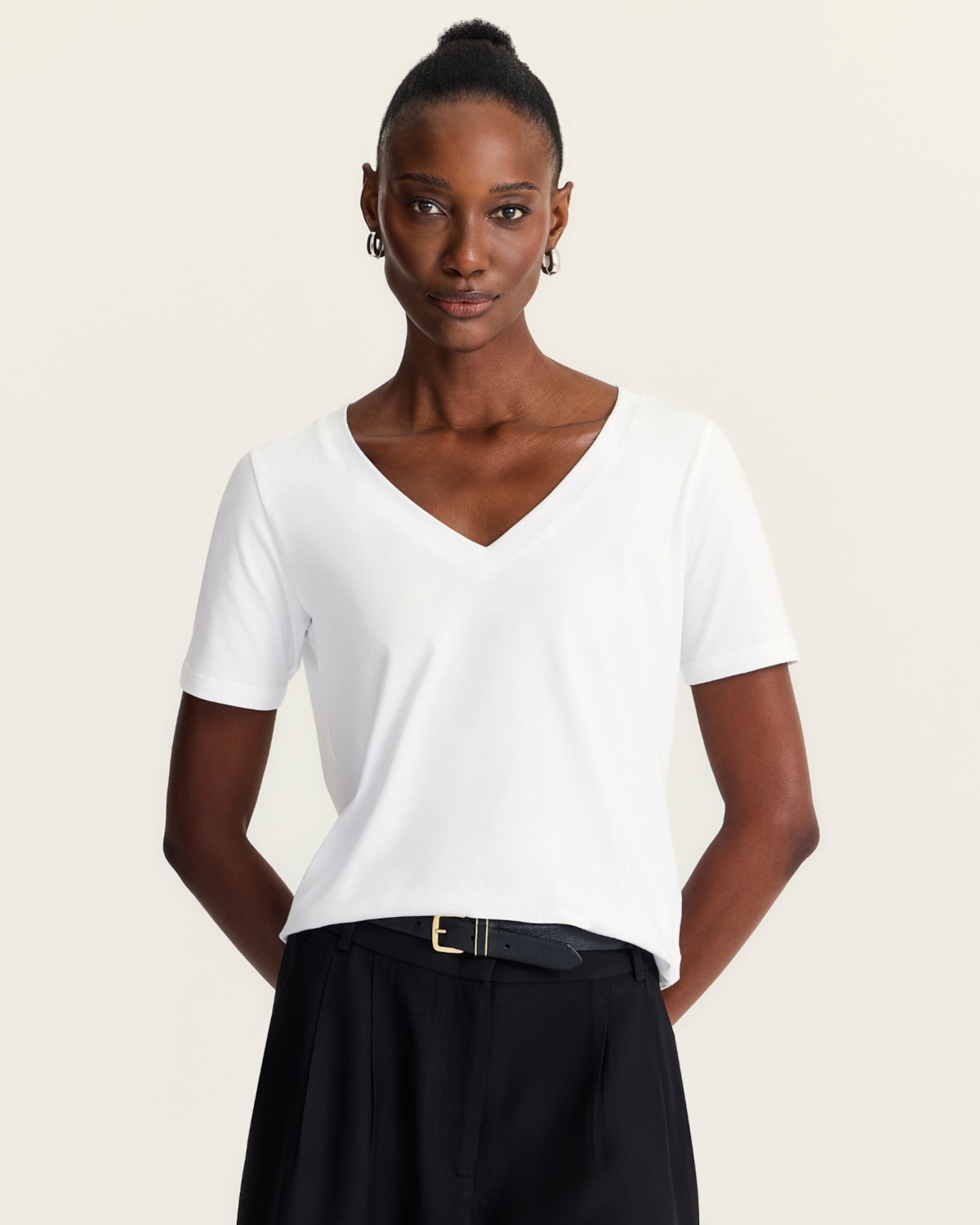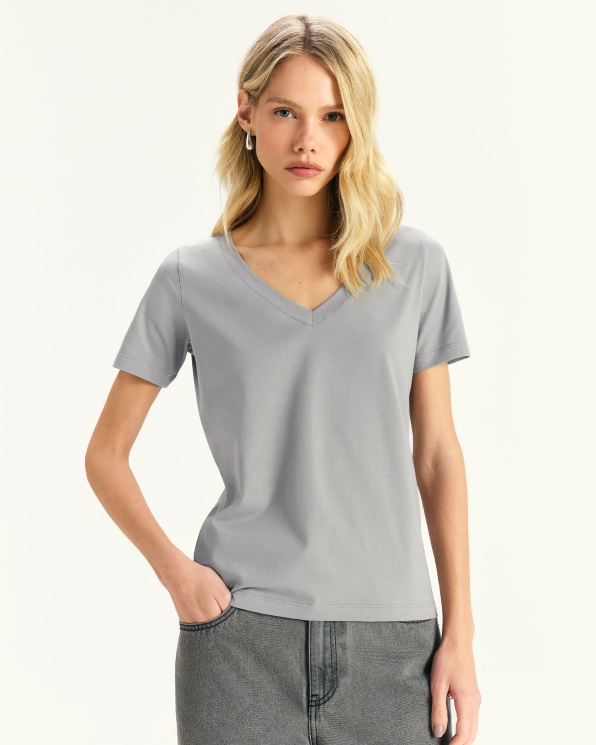 Decote clássico e elegante: A gola V mais aberta valoriza o colo e alonga a silhueta.