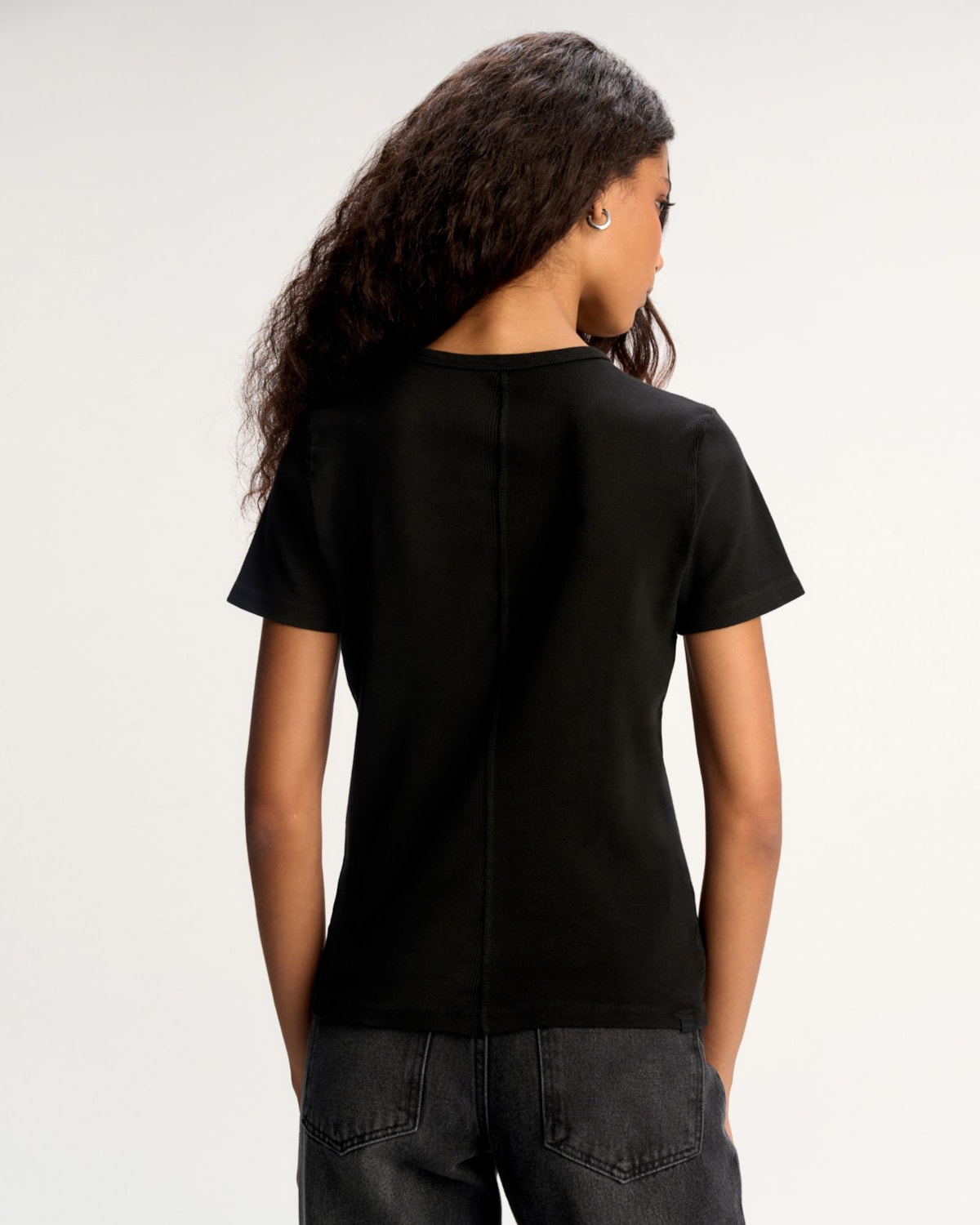 Mangas e Acabamento: As mangas curtas acompanham o shape justo da peça. A barra das mangas também recebe o acabamento com contraste em preto, criando uma harmonia visual com a gola.