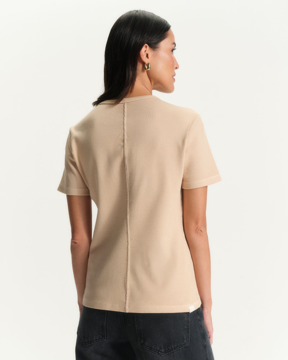 Decote: Apresenta decote redondo clássico com acabamento em ribana do próprio tecido. Esse detalhe confere um ar despojado e chique, garantindo a estrutura necessária para que a gola fique sempre no lugar com o ajuste perfeito.