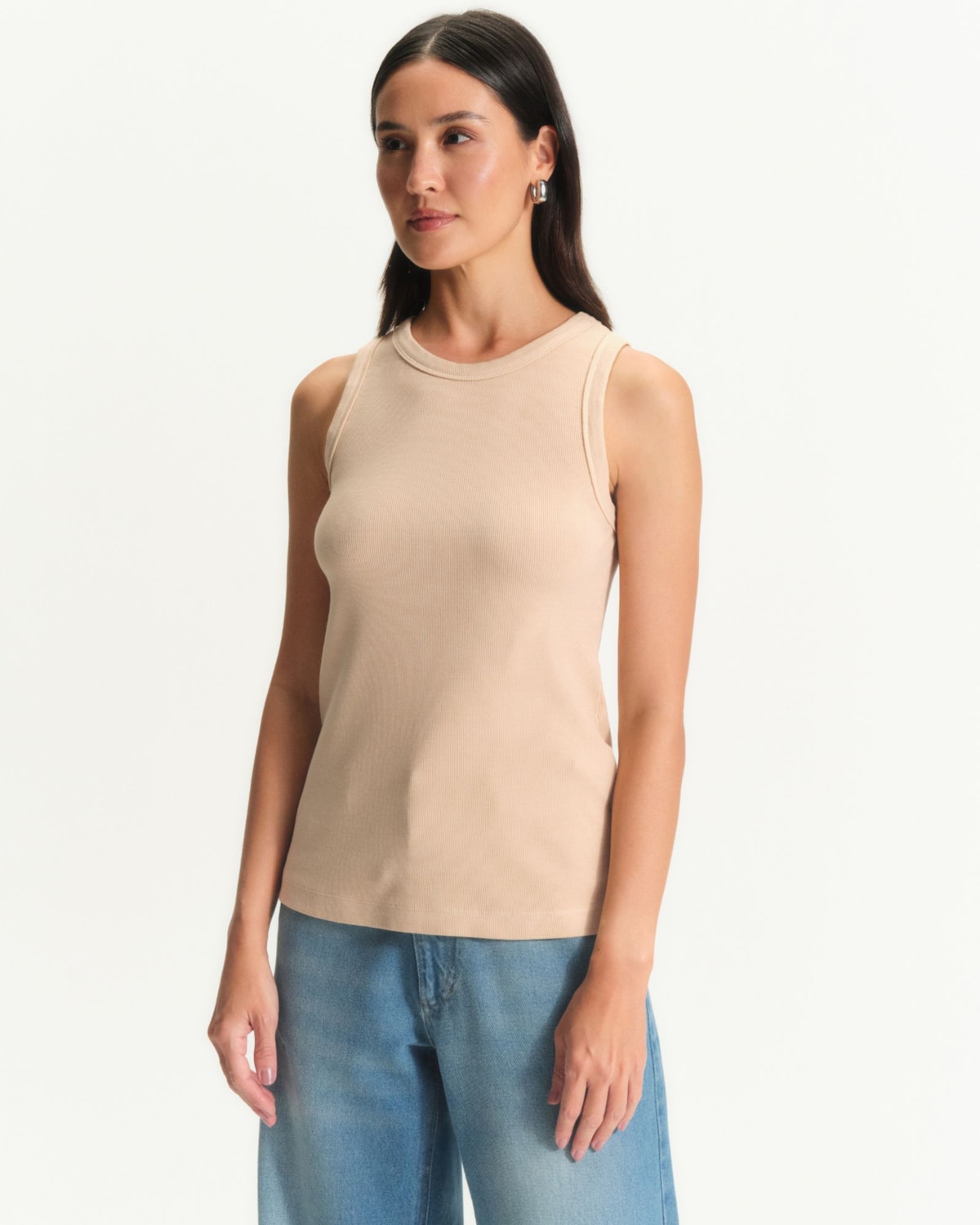 Kit Regata Canelada Camys com um desconto exclusivo de 20% OFF. Contém duas regatas femininas em cores essenciais (bege sand e off white), confeccionadas em algodão canelado soft touch.