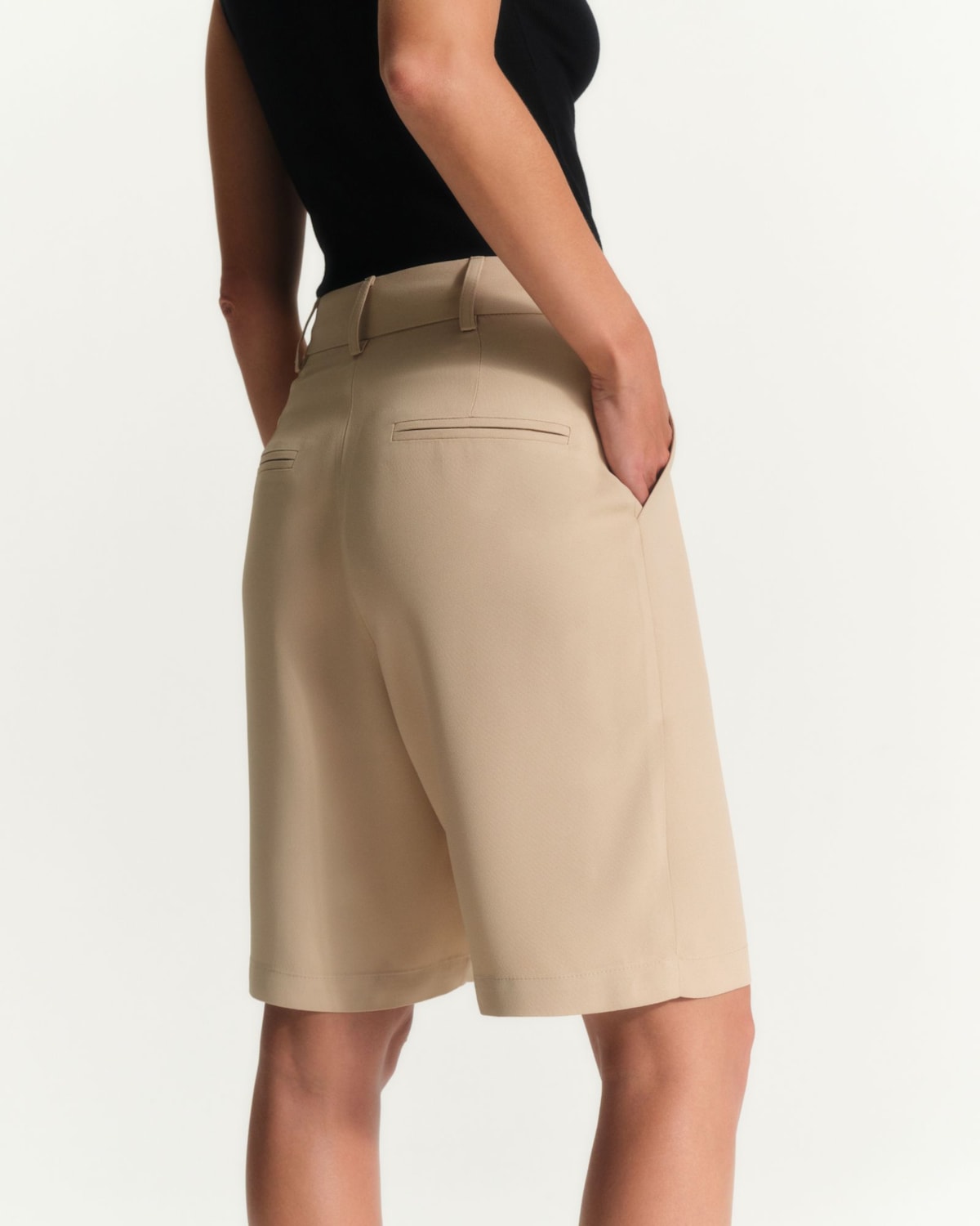 Shape e Modelagem: A modelagem de alfaiataria apresenta um comprimento elegante e moderno. As pregas frontais duplas conferem um volume sofisticado e um caimento impecável, que valoriza a silhueta com movimento.