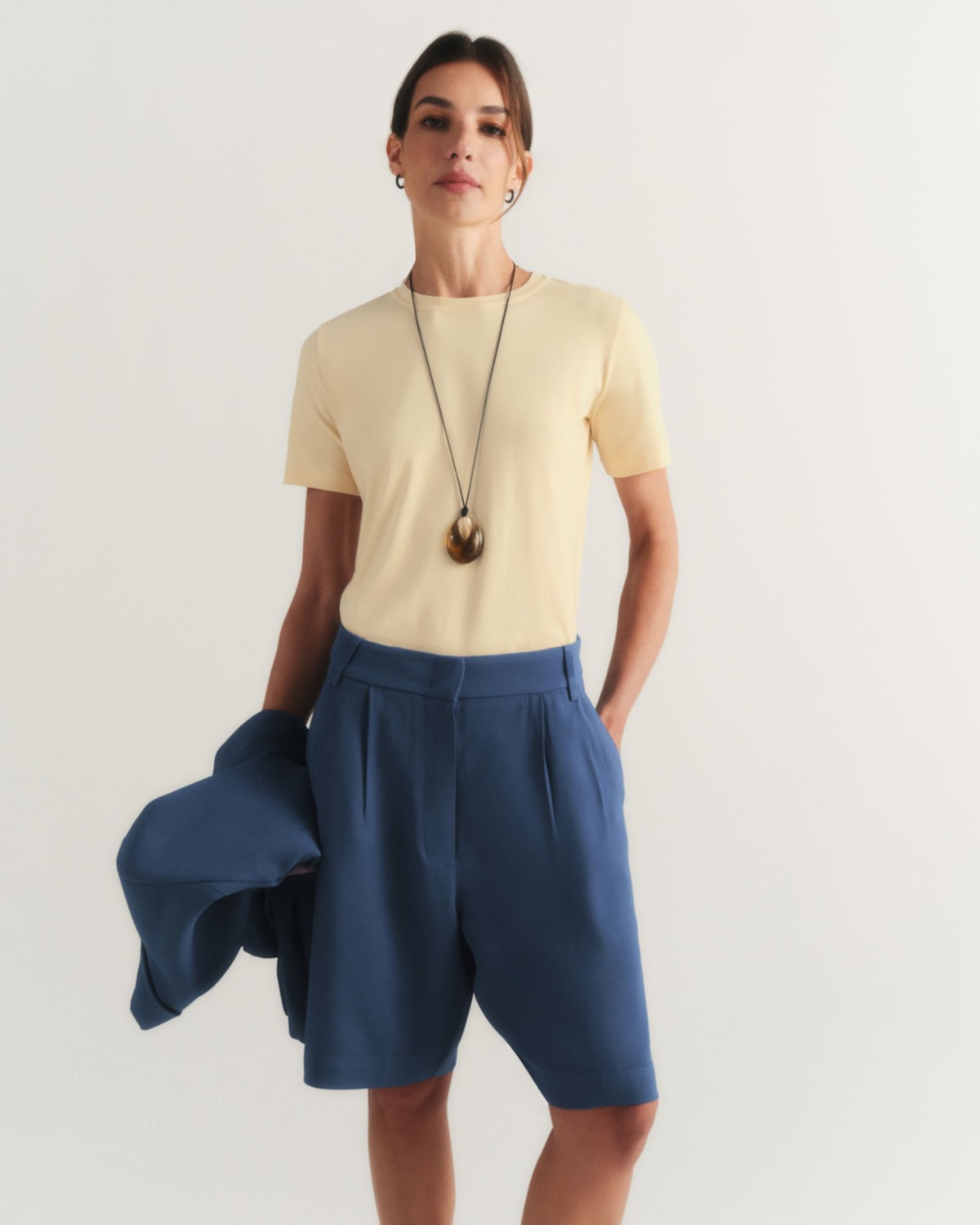 Shape e Modelagem: A modelagem de alfaiataria apresenta um comprimento elegante e moderno. As pregas frontais duplas conferem um volume sofisticado e um caimento impecável, que valoriza a silhueta com movimento.