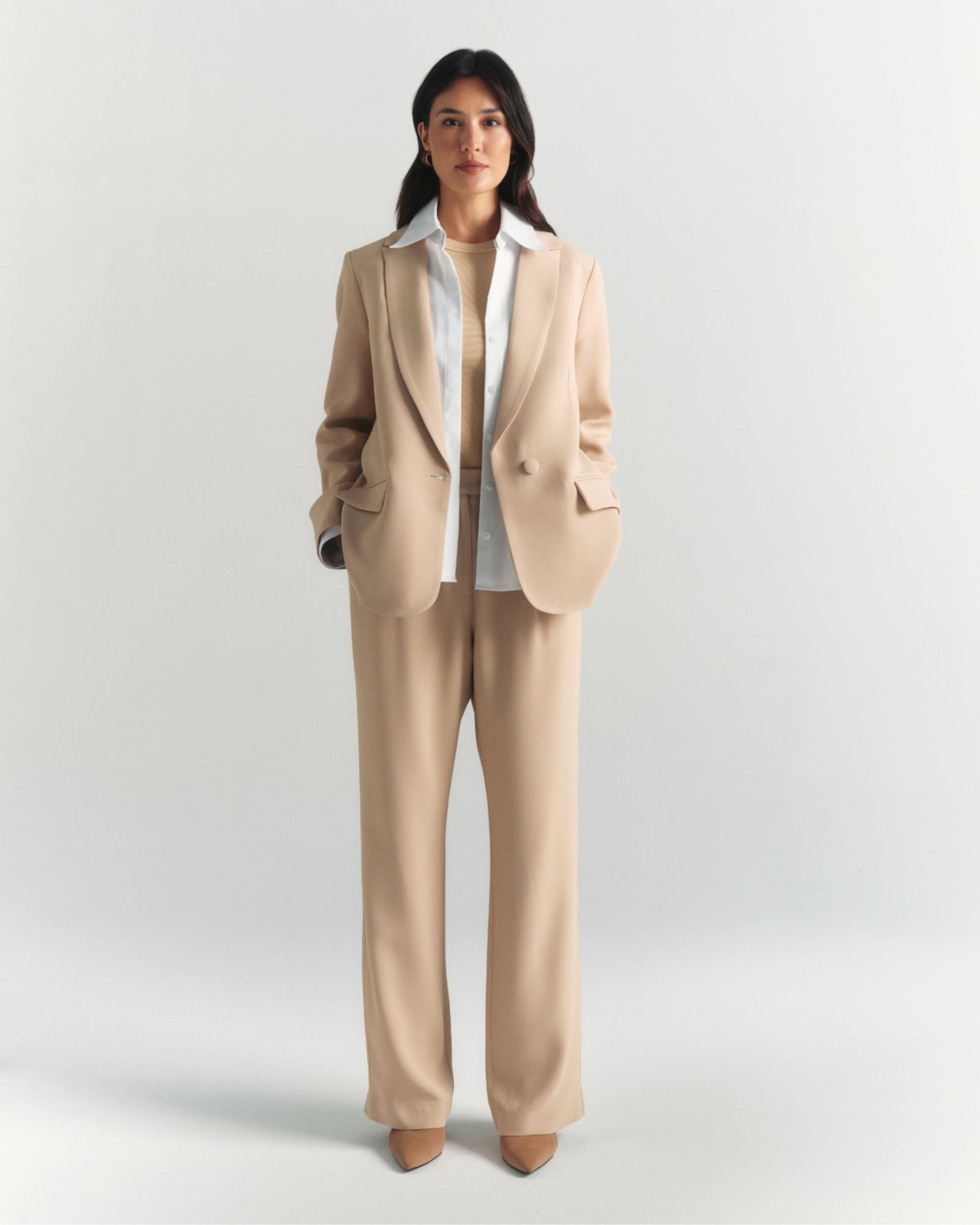 Tecido Premium e Forro: Confeccionado em Crepe Patou, um tecido nobre de toque macio e caimento fluido que acompanha os movimentos com suavidade. O forro interno foi escolhido por sua alta respirabilidade, garantindo conforto durante todo o dia.