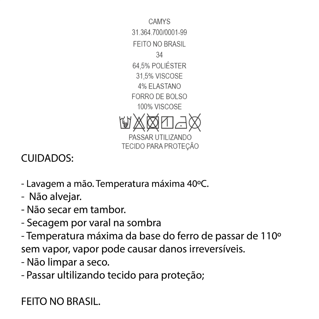 Composição: Tecido: | 64,5% poliéster, 31,5% viscose e 4% elastano