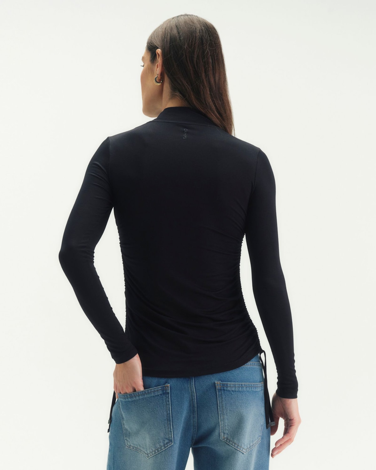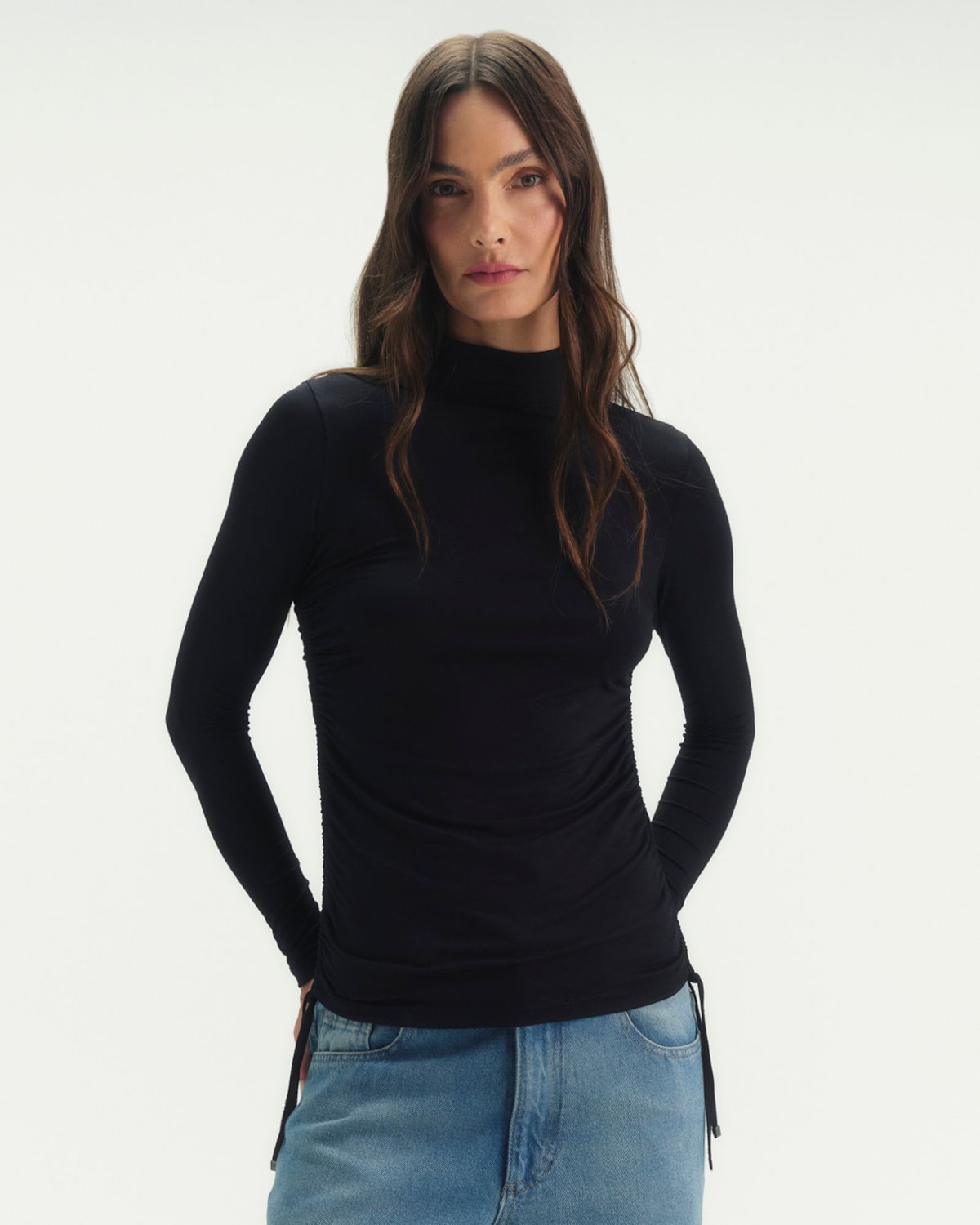 Detalhes: Apresenta gola alta sofisticada e mangas longas, valorizando o visual com elegância. O destaque exclusivo fica por conta do franzido regulável nas laterais, entregando máxima versatilidade e permitindo o uso de diversas maneiras, seja de forma assimétrica, encurtada ou mais alongada.