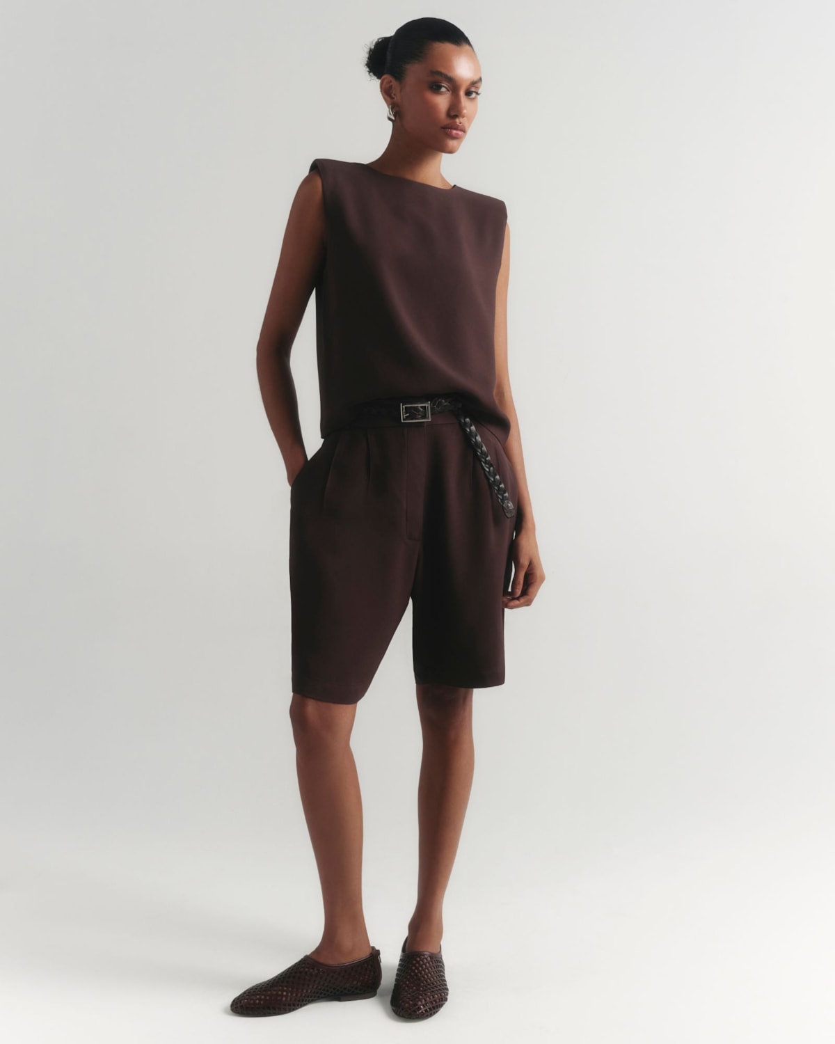 Ombros e Acabamento: Os ombros são estruturados com ombreiras internas, criando a silhueta poderosa e elegante da muscle tee. Os acabamentos são totalmente embutidos no forro, resultado de uma construção primorosa que permite o uso dos dois lados com perfeição.