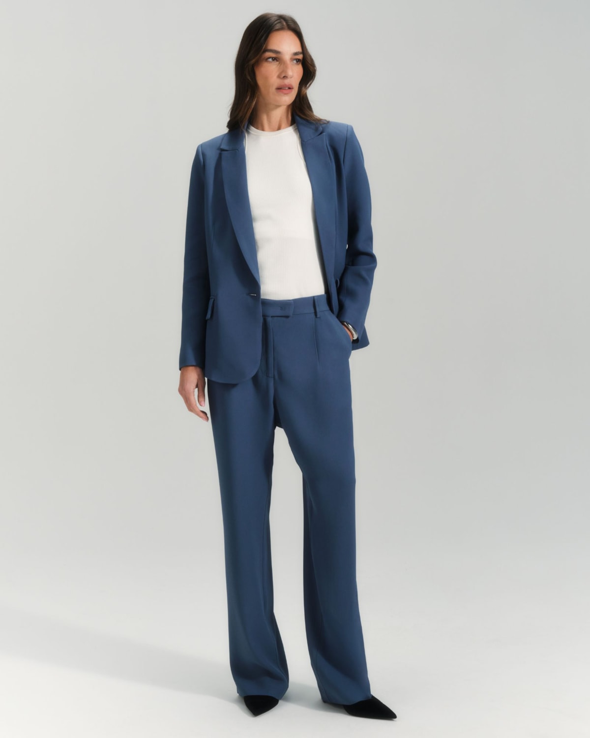 Shape e Modelagem: A modelagem de shape reto é um clássico da alfaiataria que alonga a silhueta. Seu design minimalista e sem vinco garante um caimento fluido e impecável, ideal para um visual moderno.