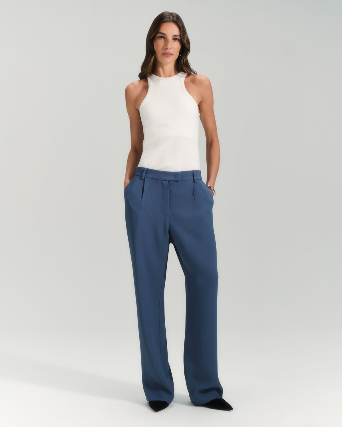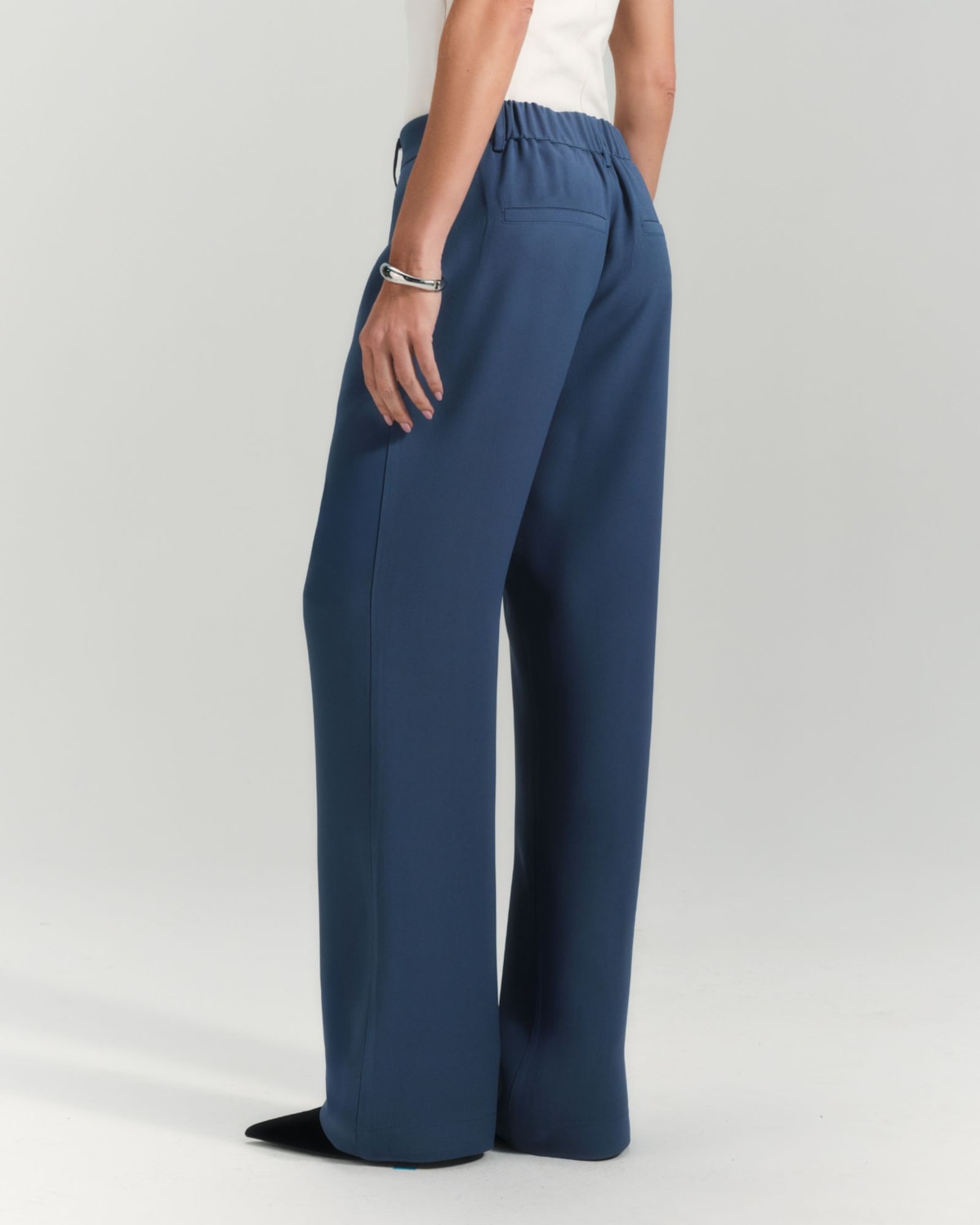 Cintura e Detalhes: A cintura possui um cós estruturado com fechamento discreto, garantindo um caimento perfeito na região. Os bolsos frontais, modelo faca, são funcionais e embutidos de forma a não criar volume.