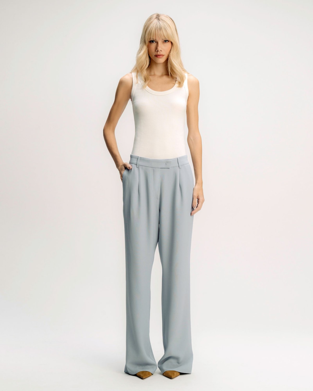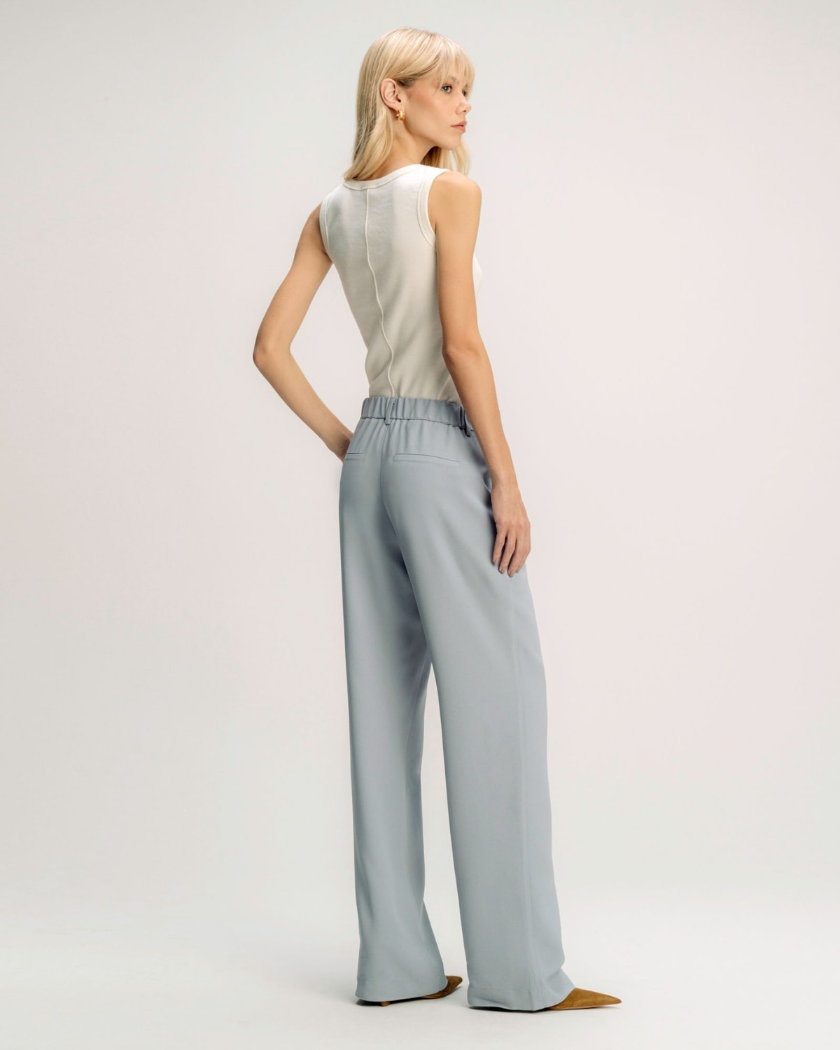 Cintura e Detalhes: A cintura possui um cós estruturado com fechamento discreto, garantindo um caimento perfeito na região. Os bolsos frontais, modelo faca, são funcionais e embutidos de forma a não criar volume.