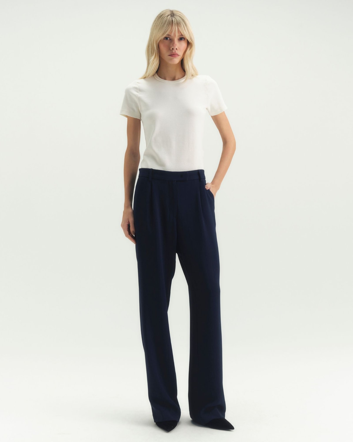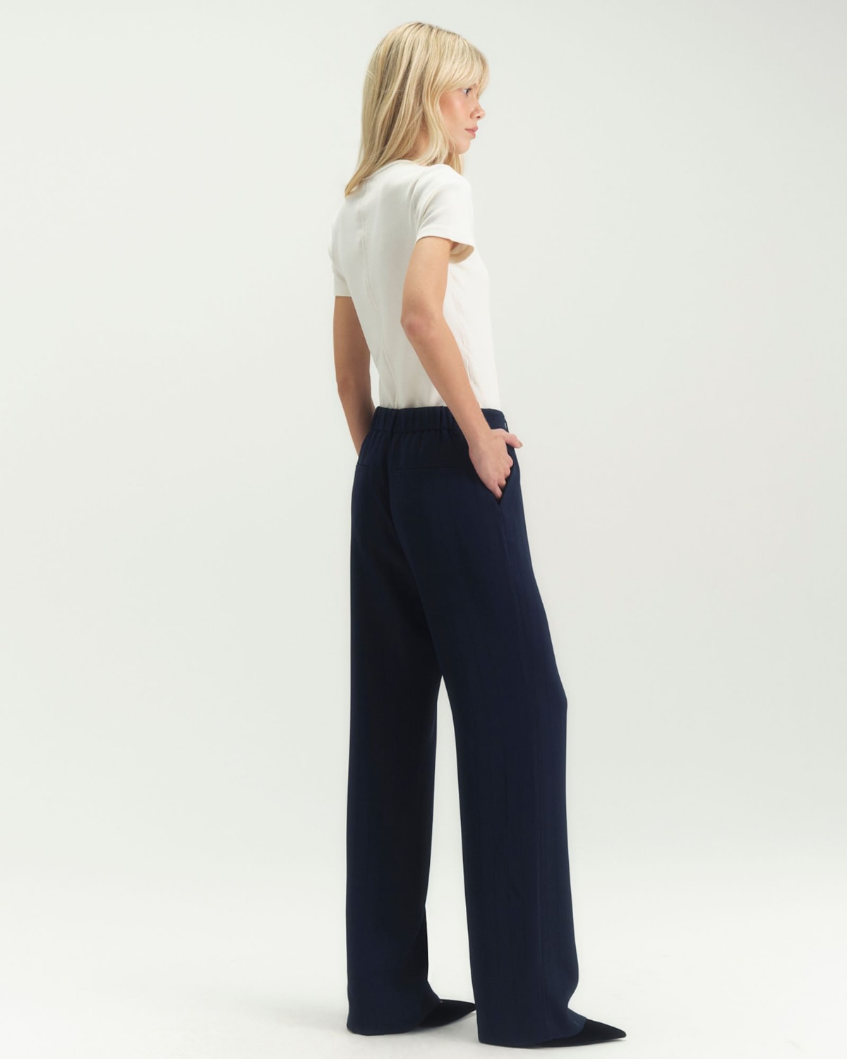 Cintura e Detalhes: A cintura possui um cós estruturado com fechamento discreto, garantindo um caimento perfeito na região. Os bolsos frontais, modelo faca, são funcionais e embutidos de forma a não criar volume.