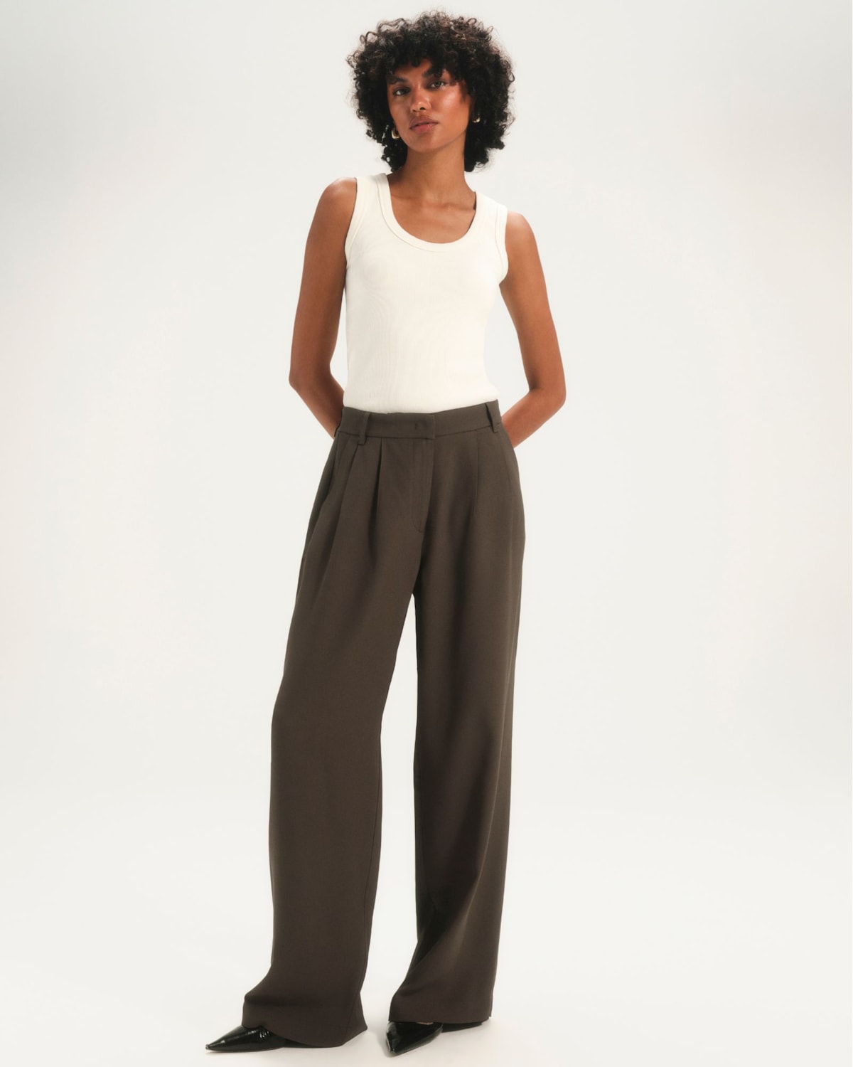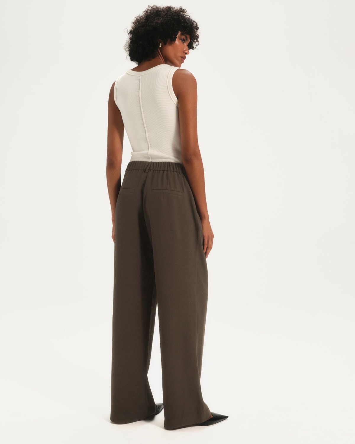 Shape e Modelagem: Modelagem de shape wide leg, que alonga a silhueta com elegância. As duas pregas frontais criam um volume preciso e um movimento sofisticado à peça. Cintura média no lugar, com elástico funcional desde o primeiro momento do uso, para o total conforto na vestibilidade ao longo do dia. Pernas amplas e com caimento mais fluído.