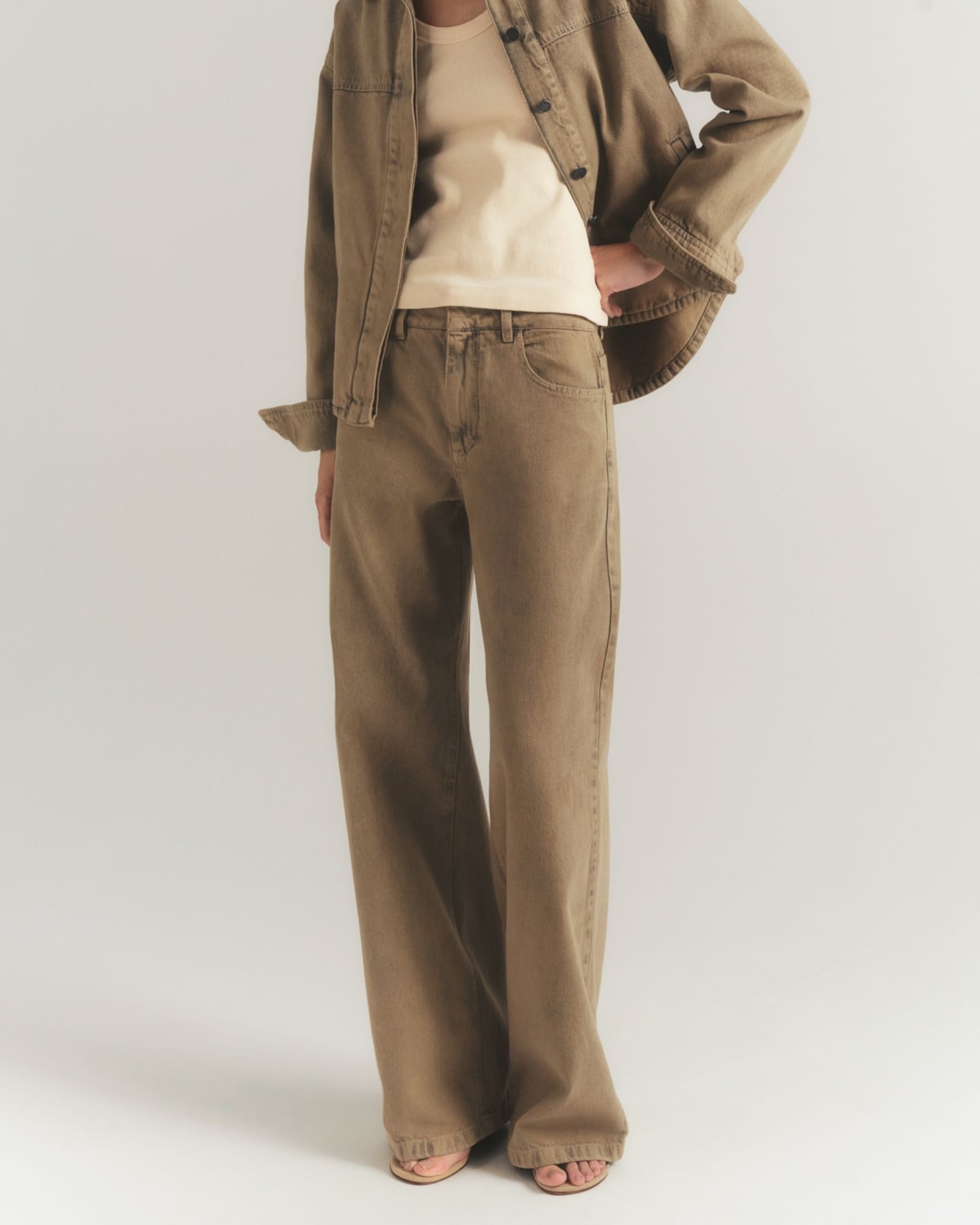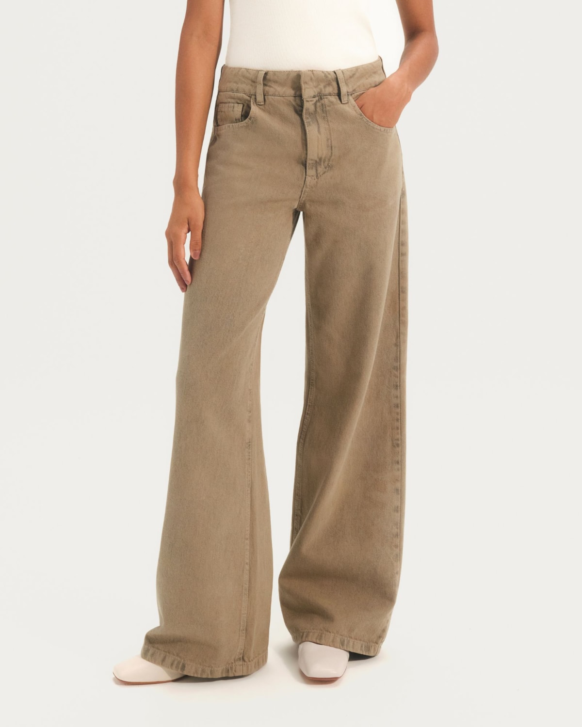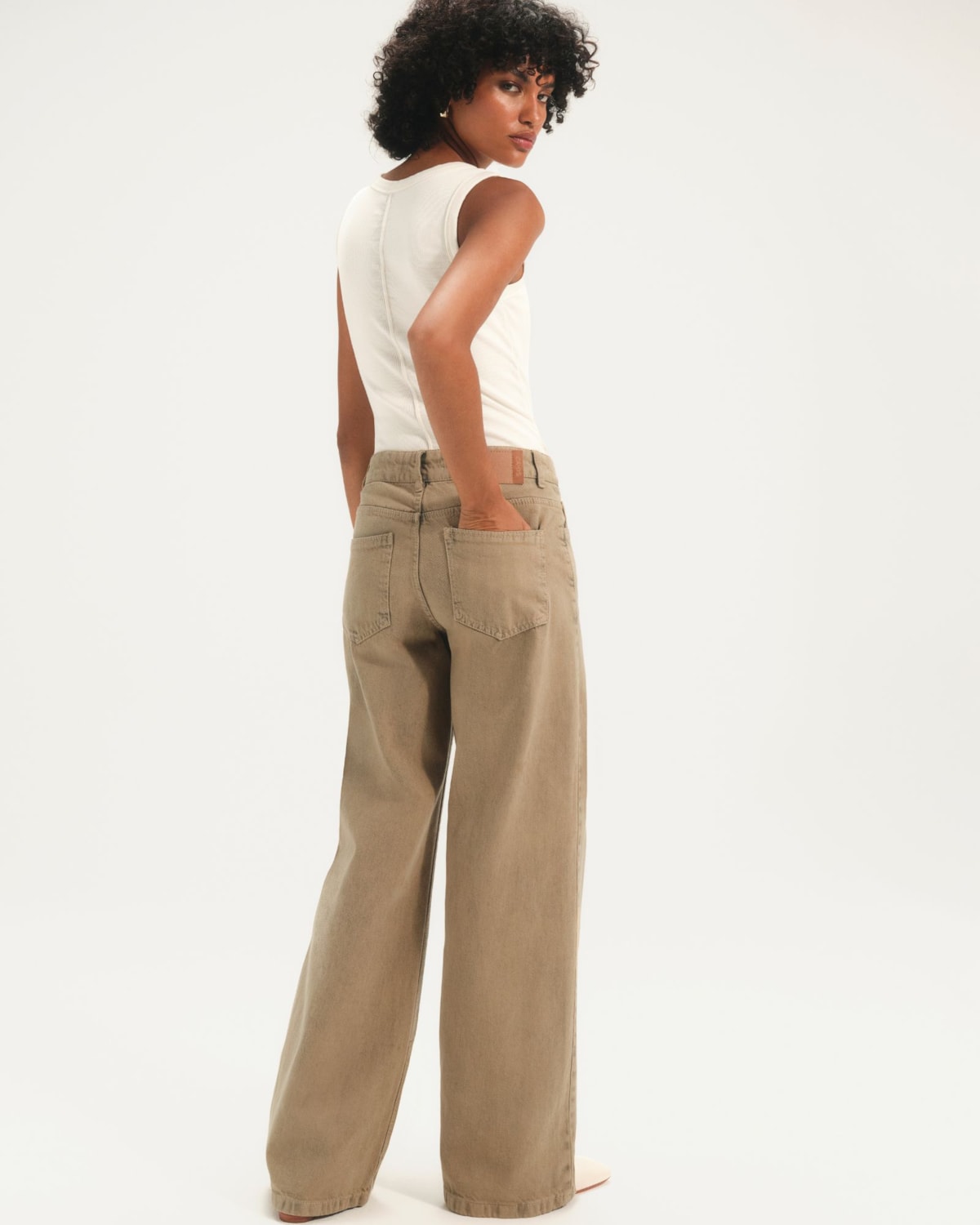 Shape e Modelagem: A modelagem de shape wide leg é elegante e contemporânea, fluindo a partir do quadril para criar uma silhueta alongada. O design foi pensado para unir o conforto do jeans com a sofisticação da alfaiataria.