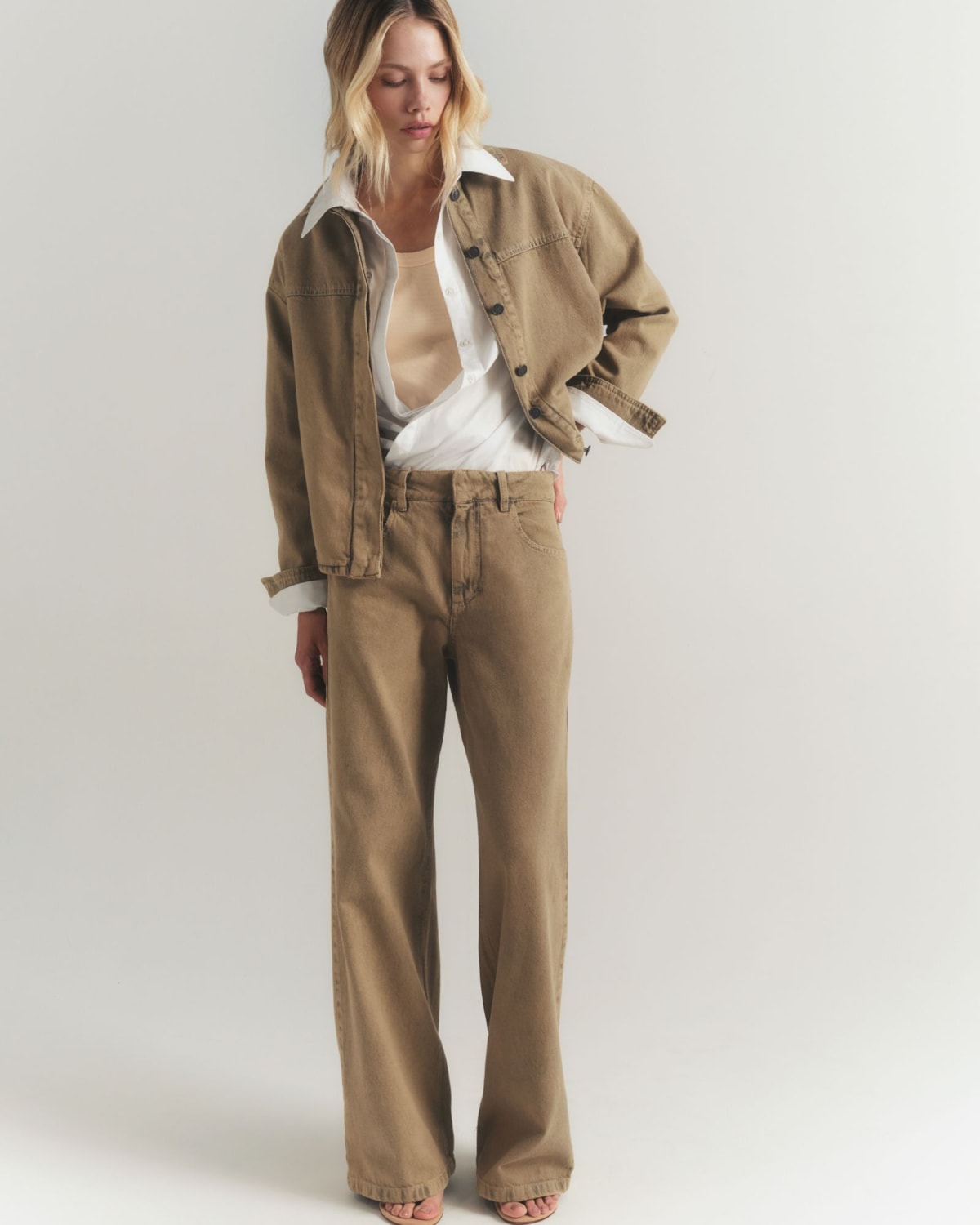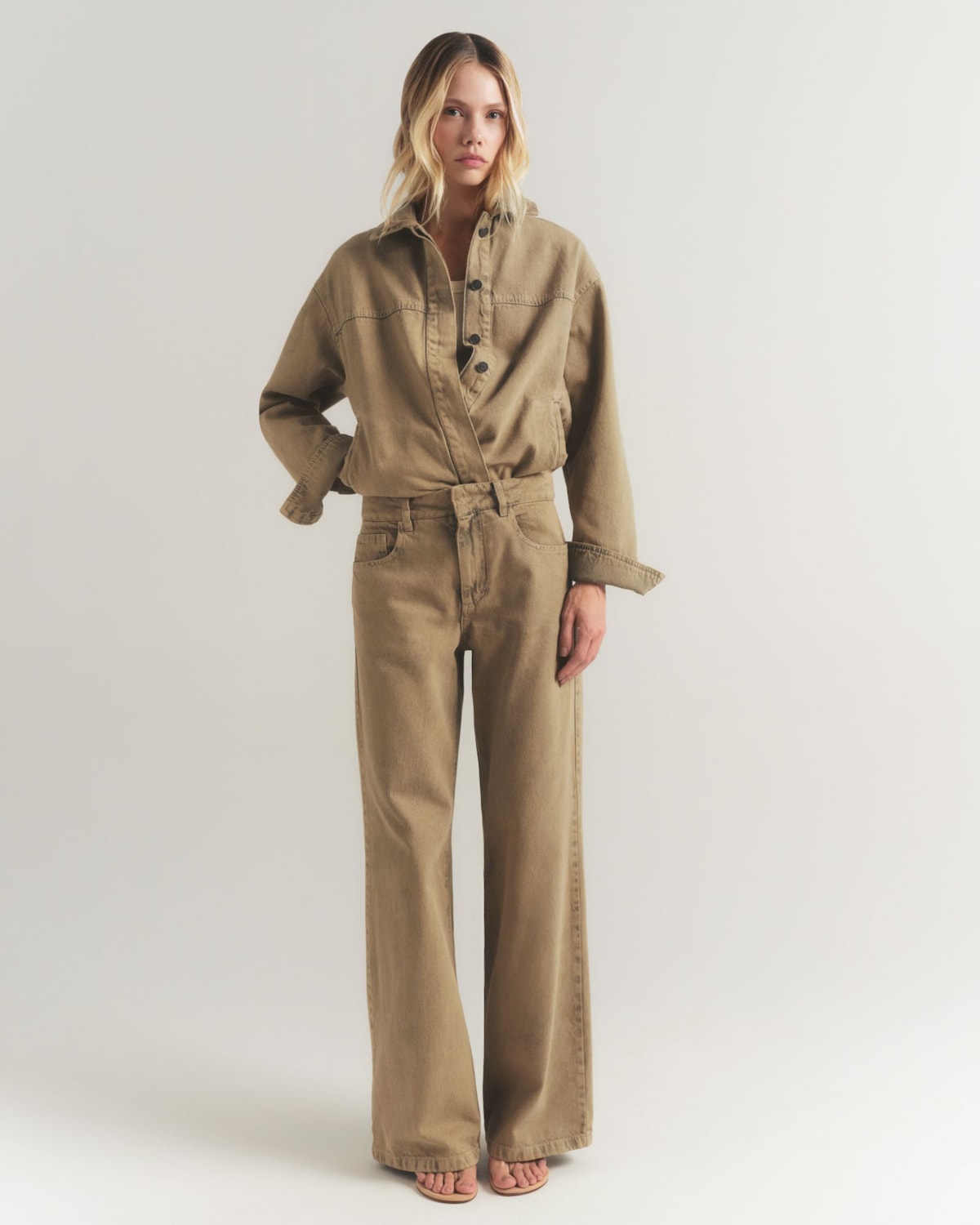 Confeccionada em denim premium, estruturado para garantir um caimento impecável. O grande diferencial é a lavagem exclusiva "Denim Sand", um tom claro e sofisticado que confere uma identidade única e versátil à peça.