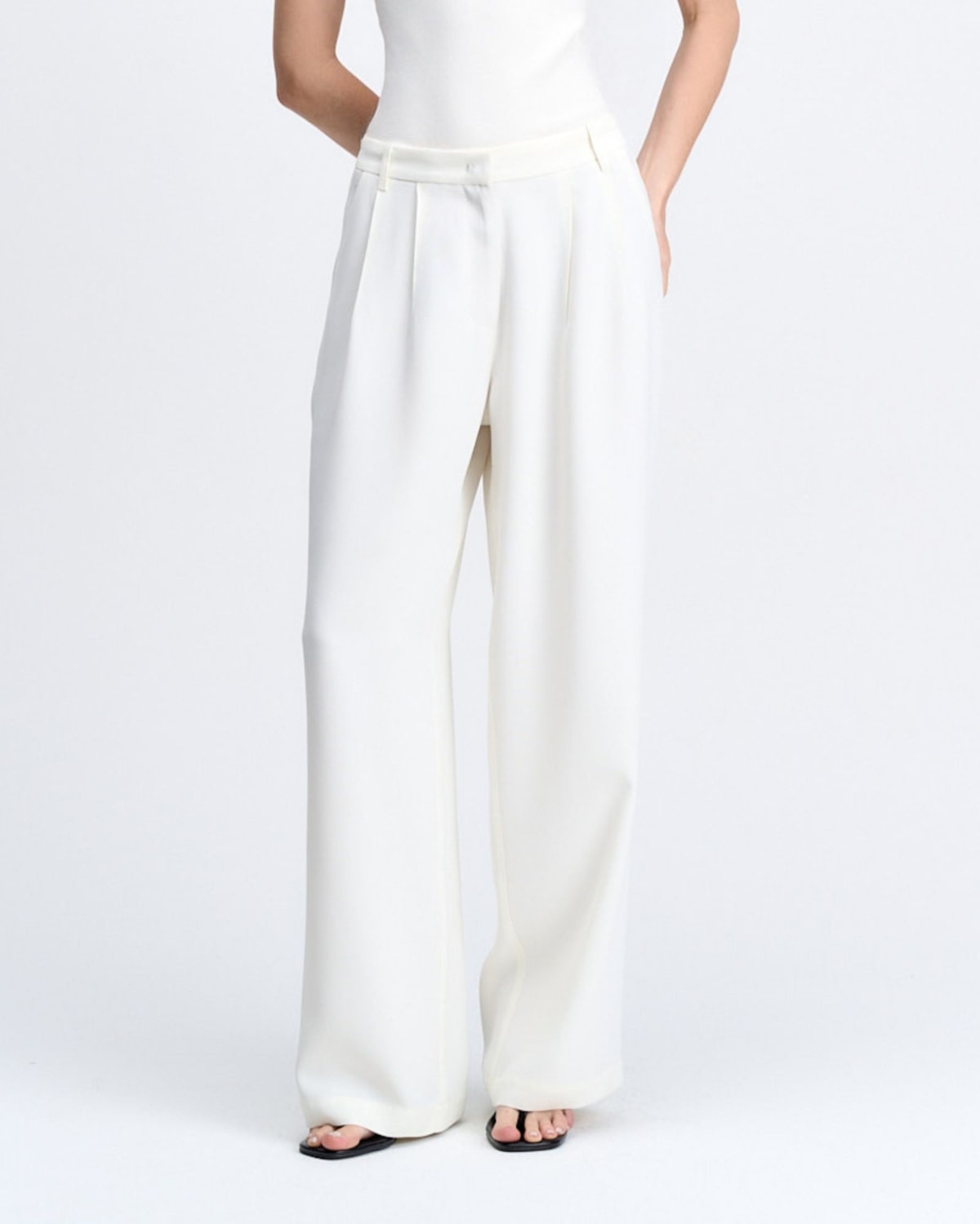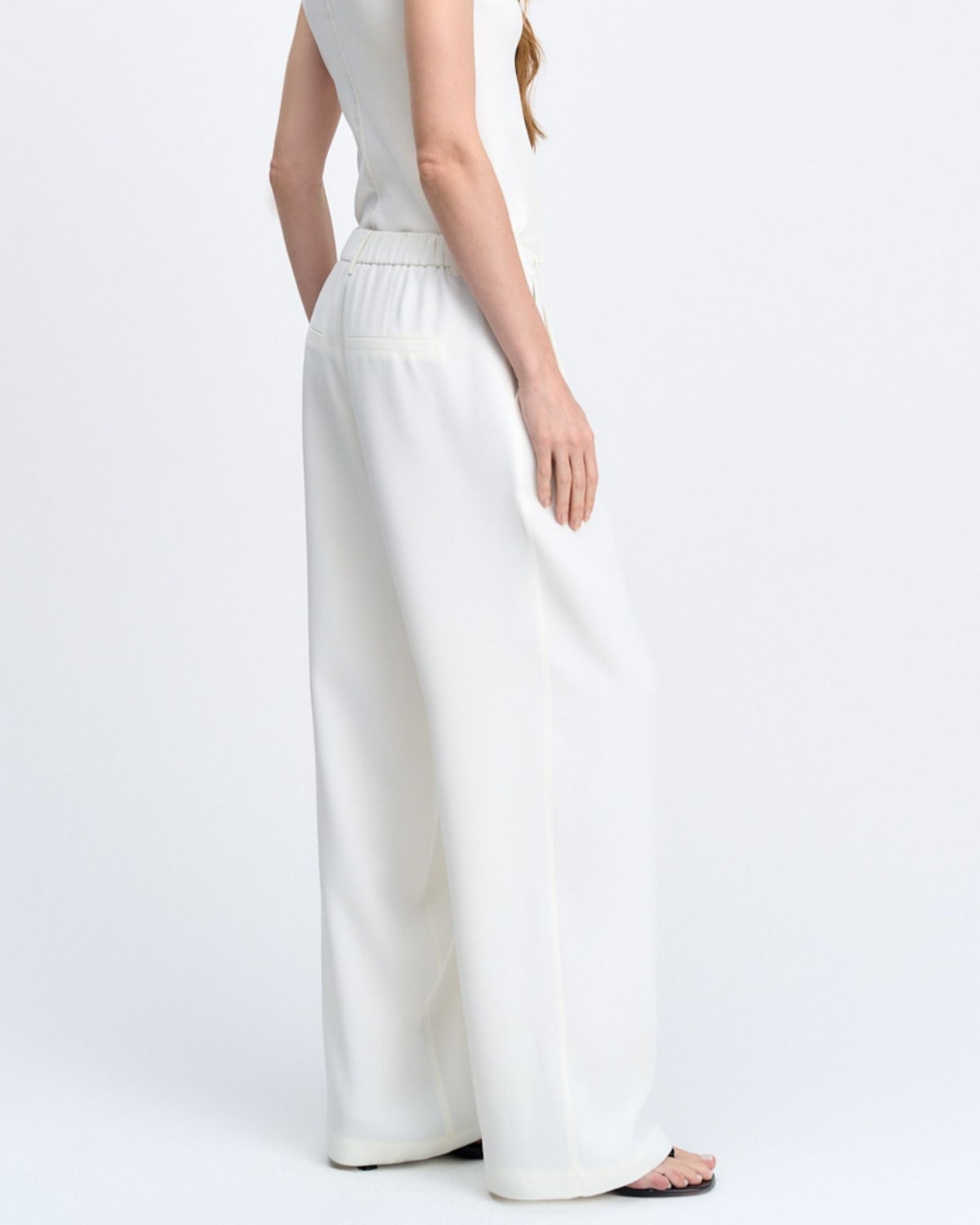 Shape e Modelagem: Modelagem de shape wide leg, que alonga a silhueta com elegância. As duas pregas frontais criam um volume preciso e um movimento sofisticado à peça. Cintura média no lugar, com elástico funcional desde o primeiro momento do uso, para o total conforto na vestibilidade ao longo do dia. Pernas amplas e com caimento mais fluído.
