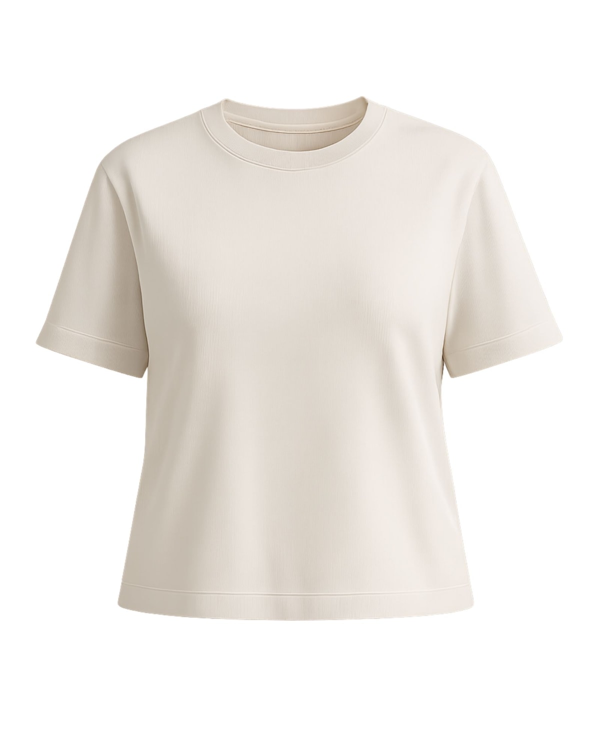 Mangas e acabamento: A costura dos ombros é levemente deslocada, criando a silhueta moderna e de caimento fluído da peça. As mangas curtas são proporcionais ao shape, garantindo conforto e estilo.