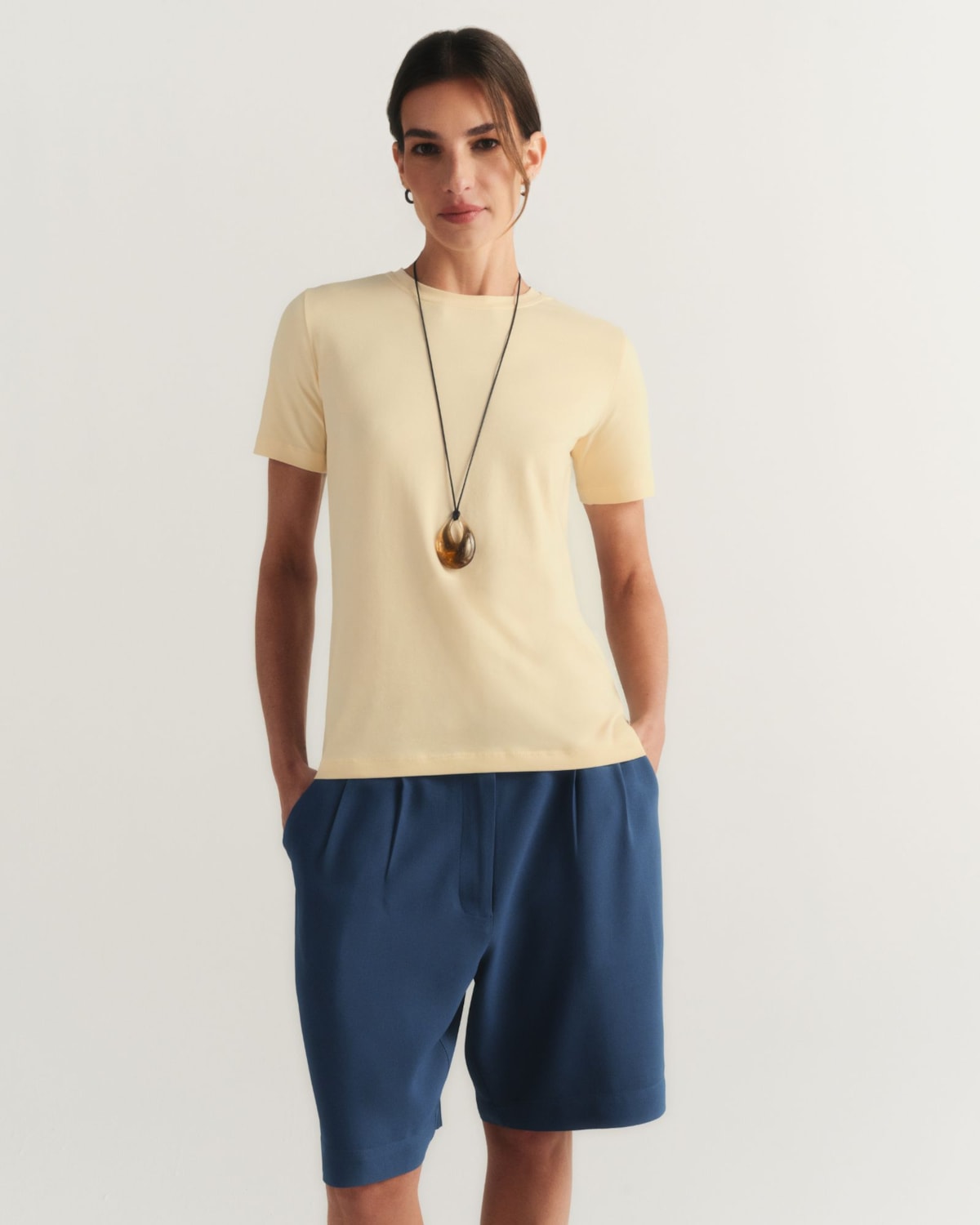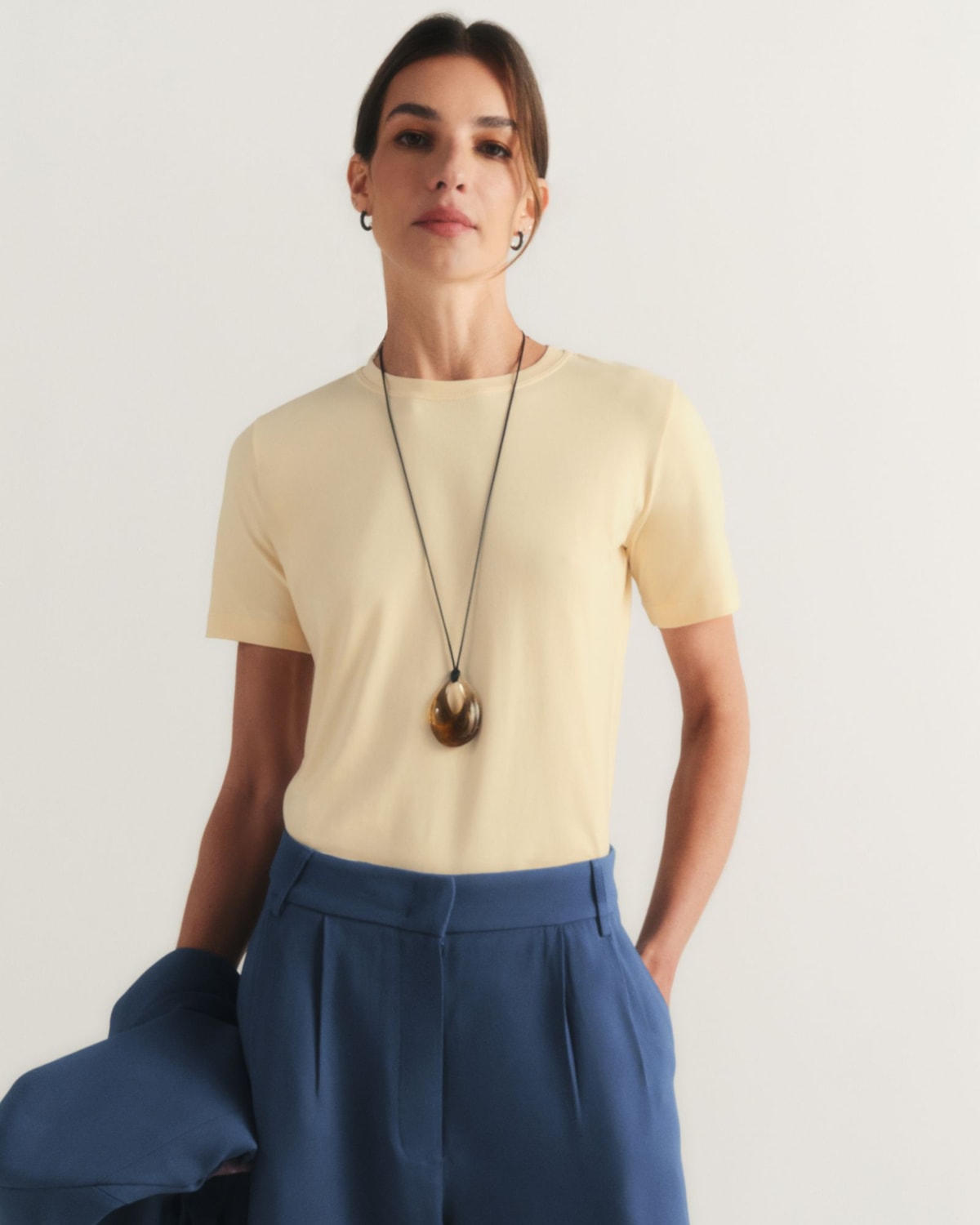 Fibras cuidadosamente selecionadas garantem um tecido uniforme, macio, com caimento impecável e toque refinado.