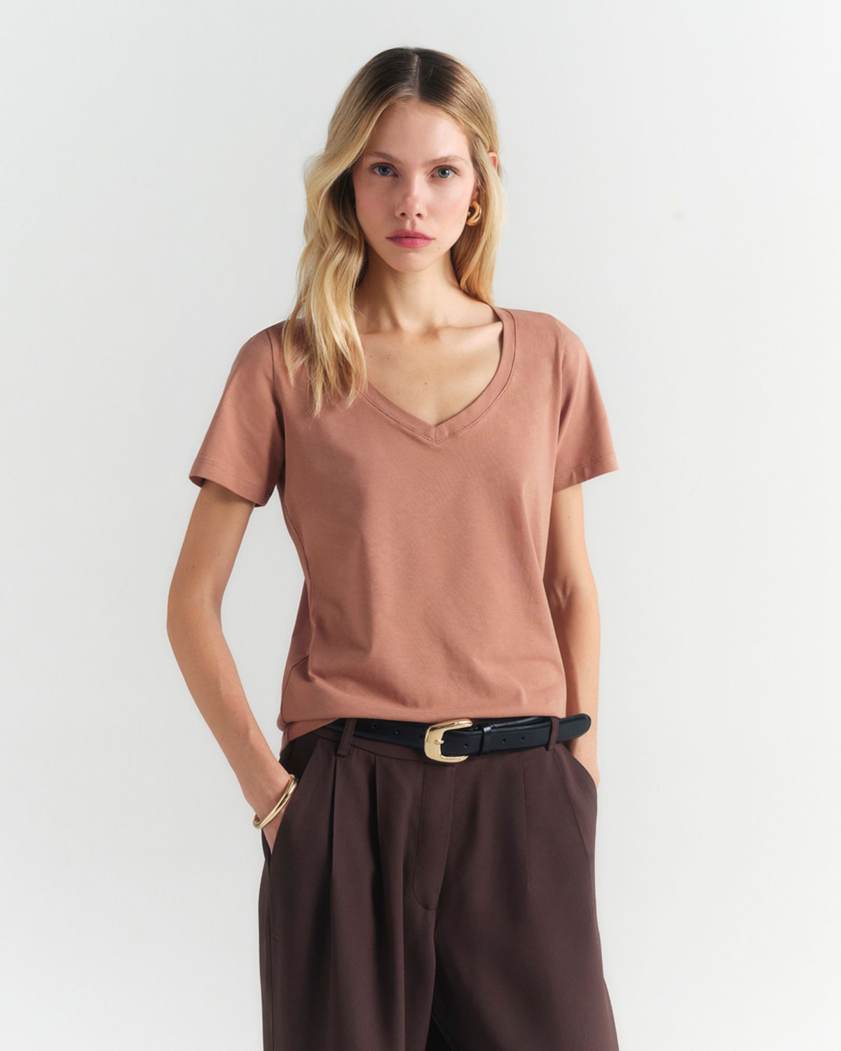 Camiseta Algodão Egípcio Camys Gola V Marrom Pecan