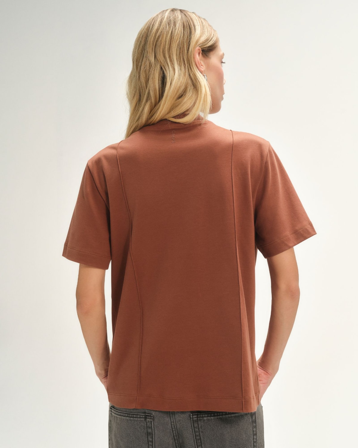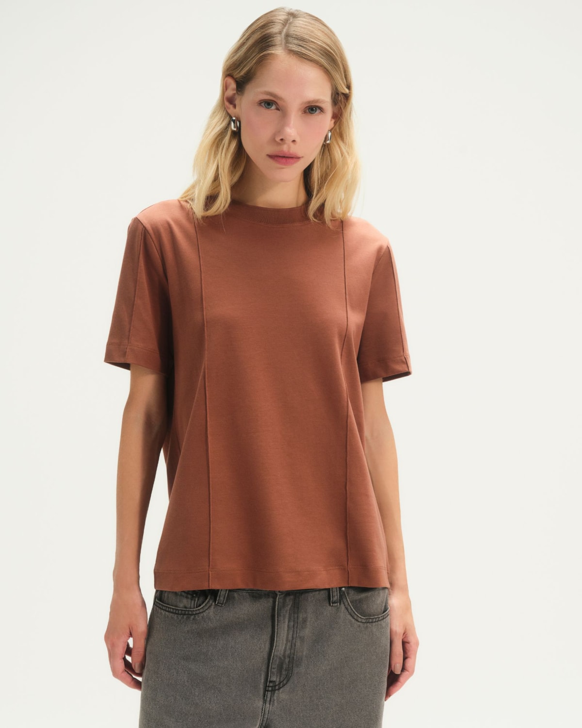 Decote: Decote redondo clássico, elevado por um delicado friso. Este detalhe confere sofisticação e uma identidade única ao design minimalista da peça.