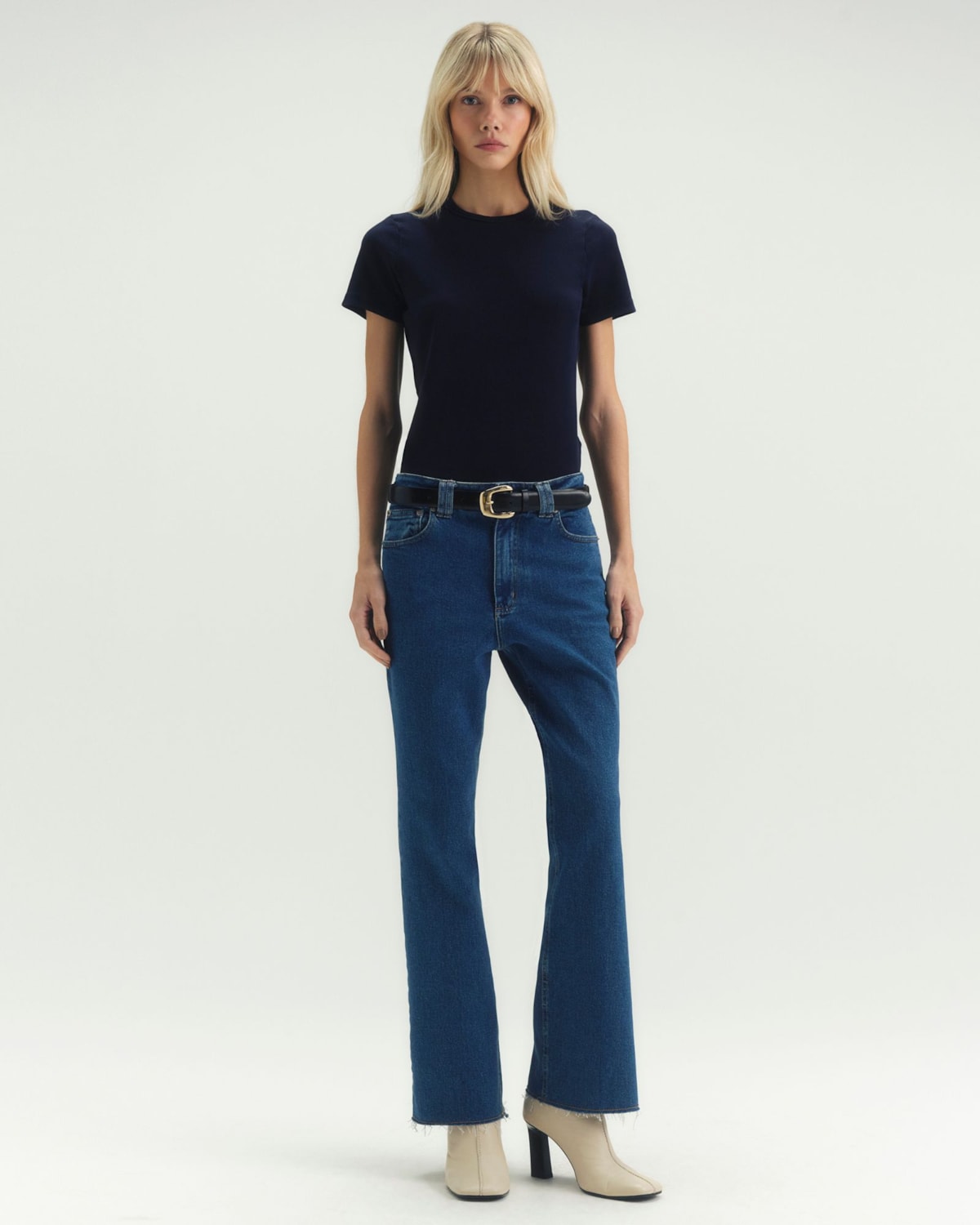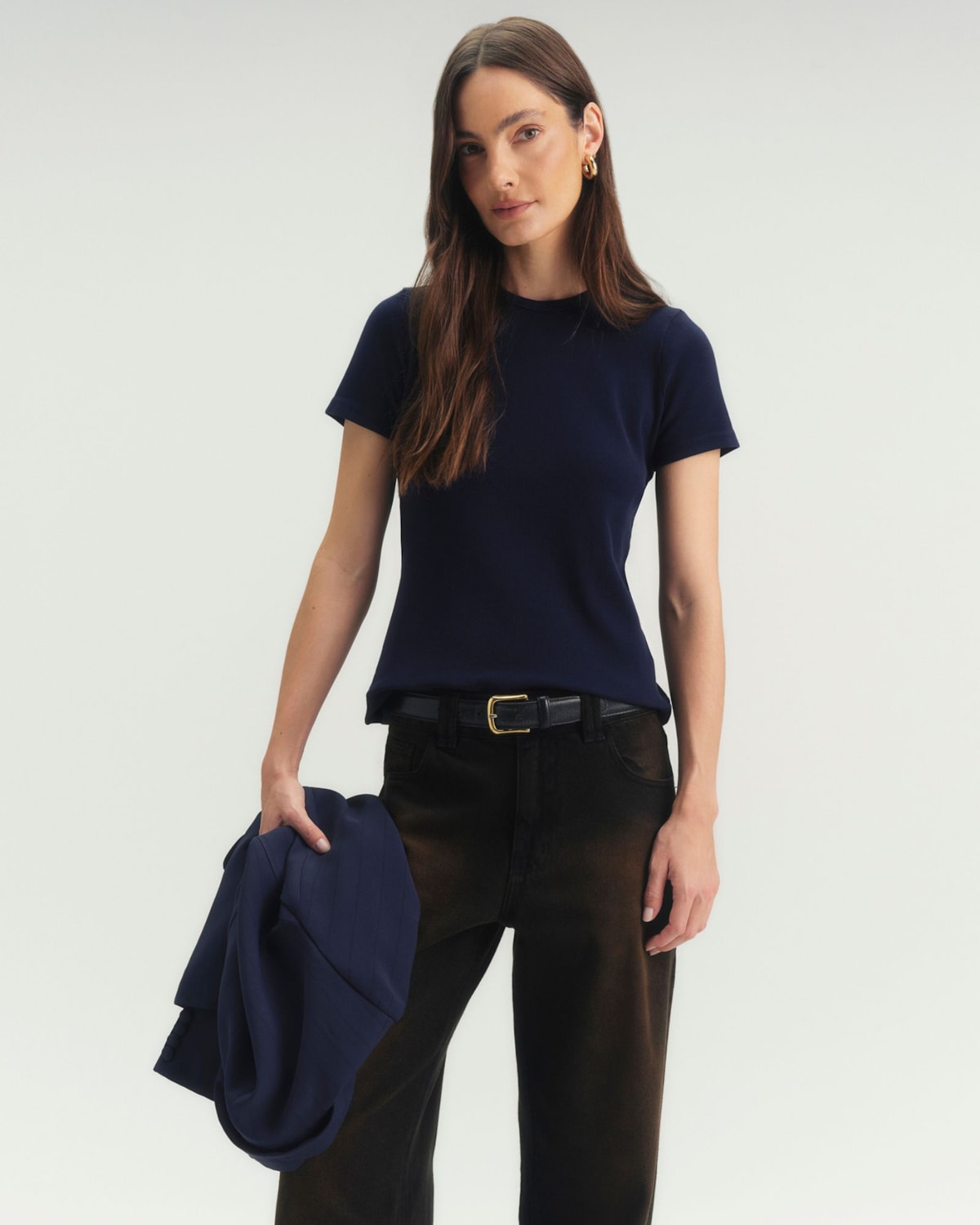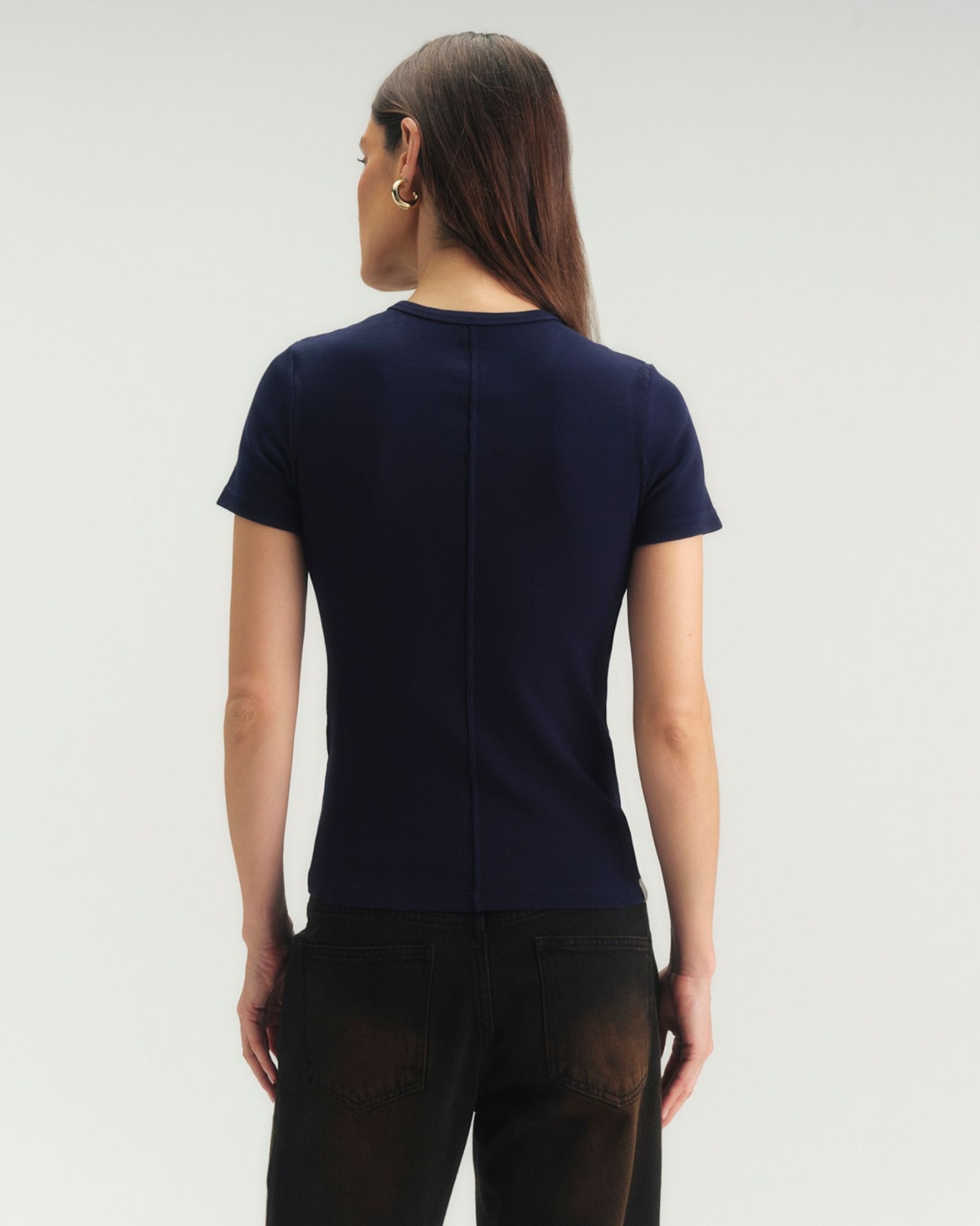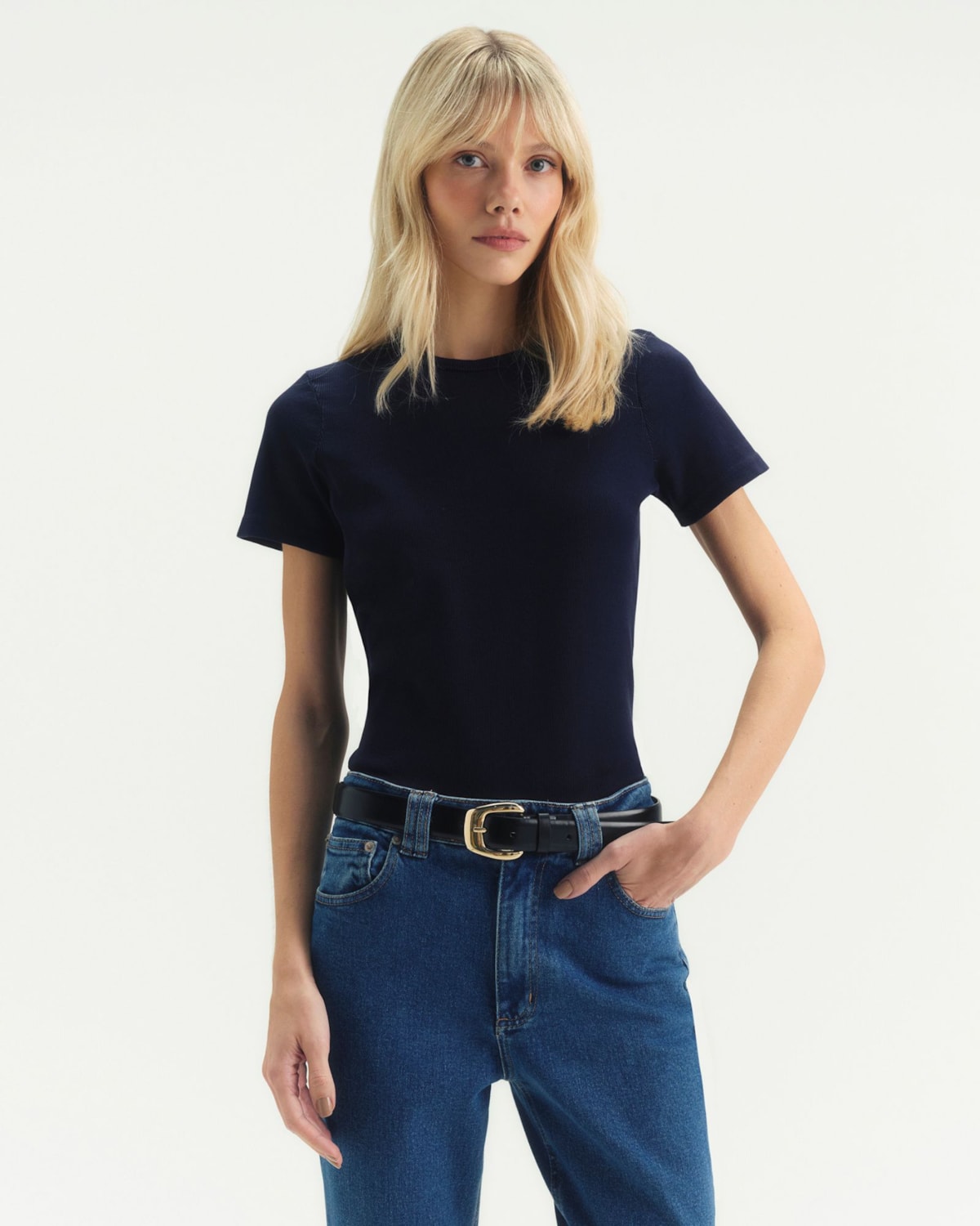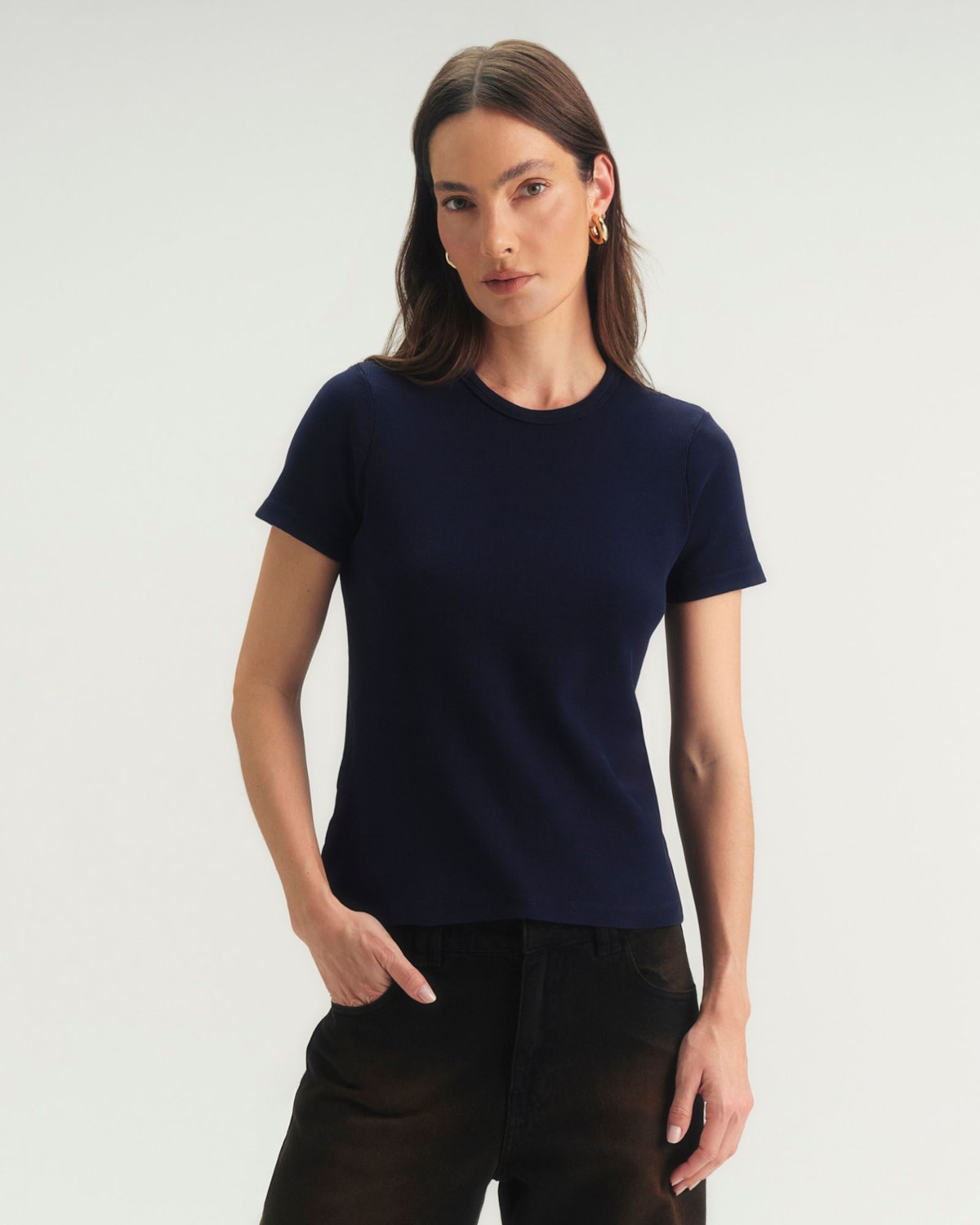 Algodão Canelado Premium: Malha canelada de algodão com toque suave e alta elasticidade. Sua composição se adapta ao corpo, sem deformar com o uso. Shape Caimento: Shape justo ao corpo que valoriza a silhueta sem restringir os movimentos. É a modelagem ideal para um visual alinhado, contemporâneo e confortável. Decote: Decote redondo clássico, que ganha destaque pelo acabamento com contraste em preto. Um detalhe gráfico que confere um toque retrô e sofisticado à peça. Mangas e Acabamento: As mangas curtas acompanham o shape justo da peça. A barra das mangas também recebe o acabamento com contraste em preto, criando uma harmonia visual com a gola. Atemporal e Essencial: Uma peça essencial que une funcionalidade e elegância, perfeita para o outono/inverno e dias de clima ameno. O detalhe de contraste a torna um ponto de interesse em looks com jeans e alfaiataria.