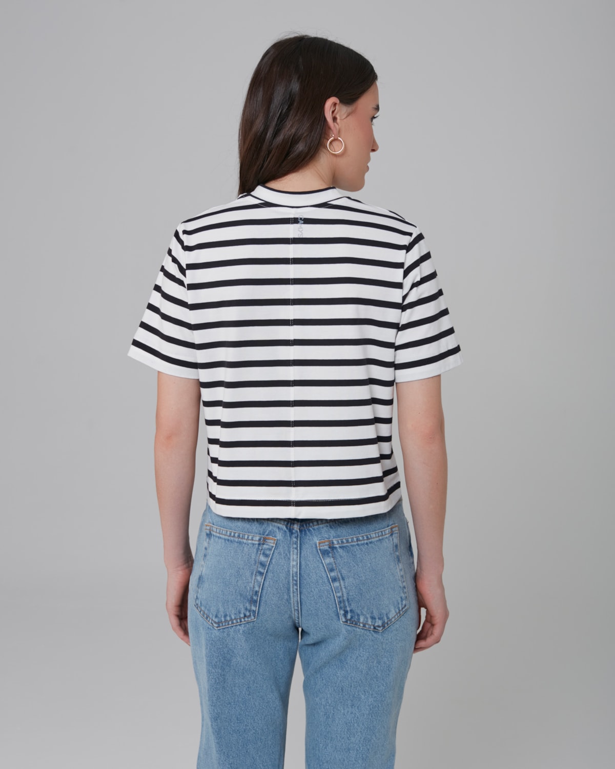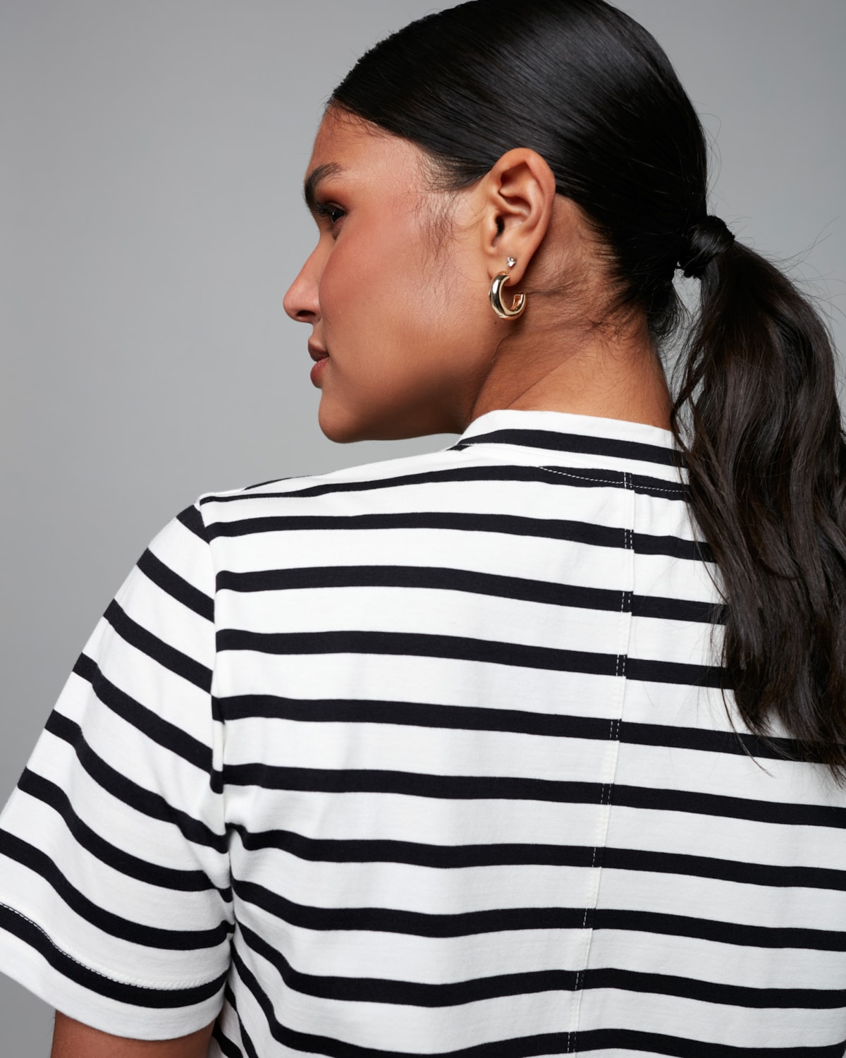 Item indispensável no closet das fashionistas, a camiseta listrada é extremamente versátil, pois permite a criação de looks sofisticados e/ou divertidos de acordo com as demais peças e acessórios escolhidos.