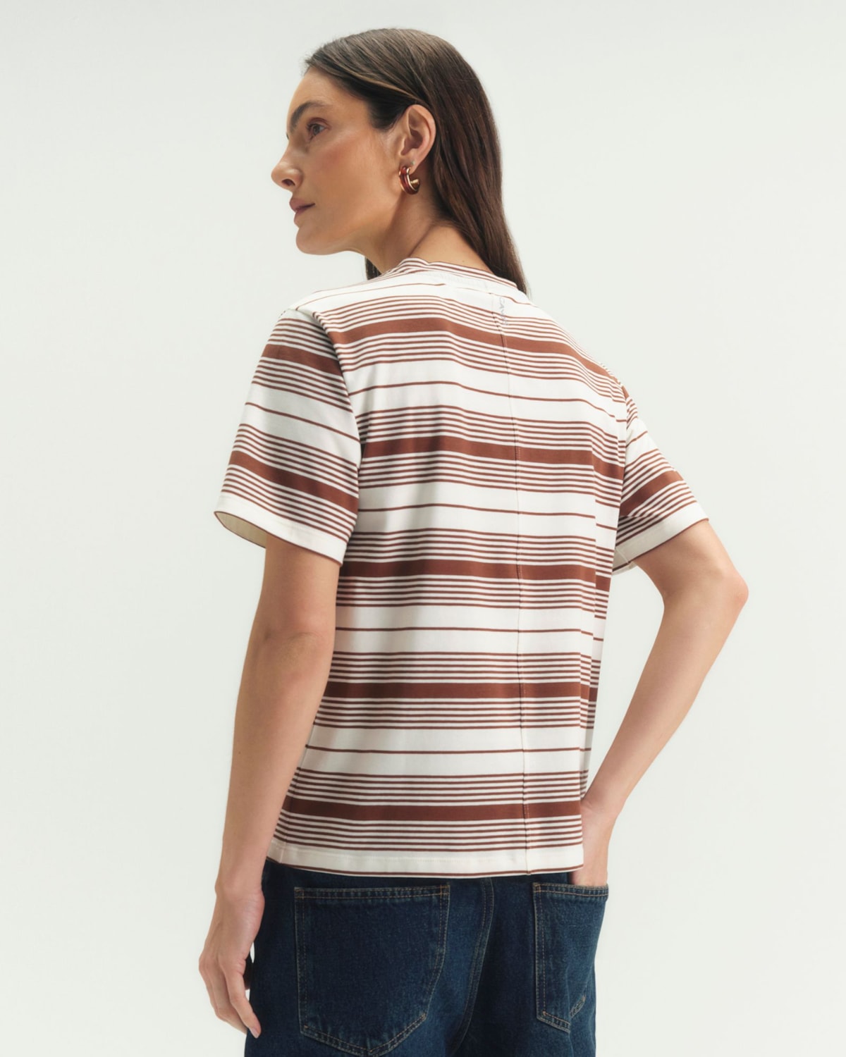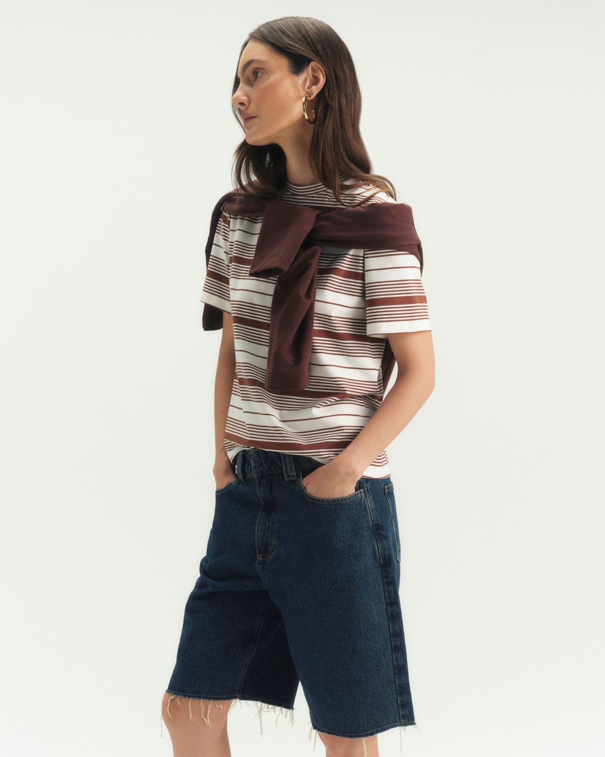 Atemporal e Essencial: As listras elevam este básico a um novo patamar de estilo, conferindo uma elegância gráfica. É a peça ideal para adicionar um ponto de interesse a looks com jeans, alfaiataria e outras peças lisas.