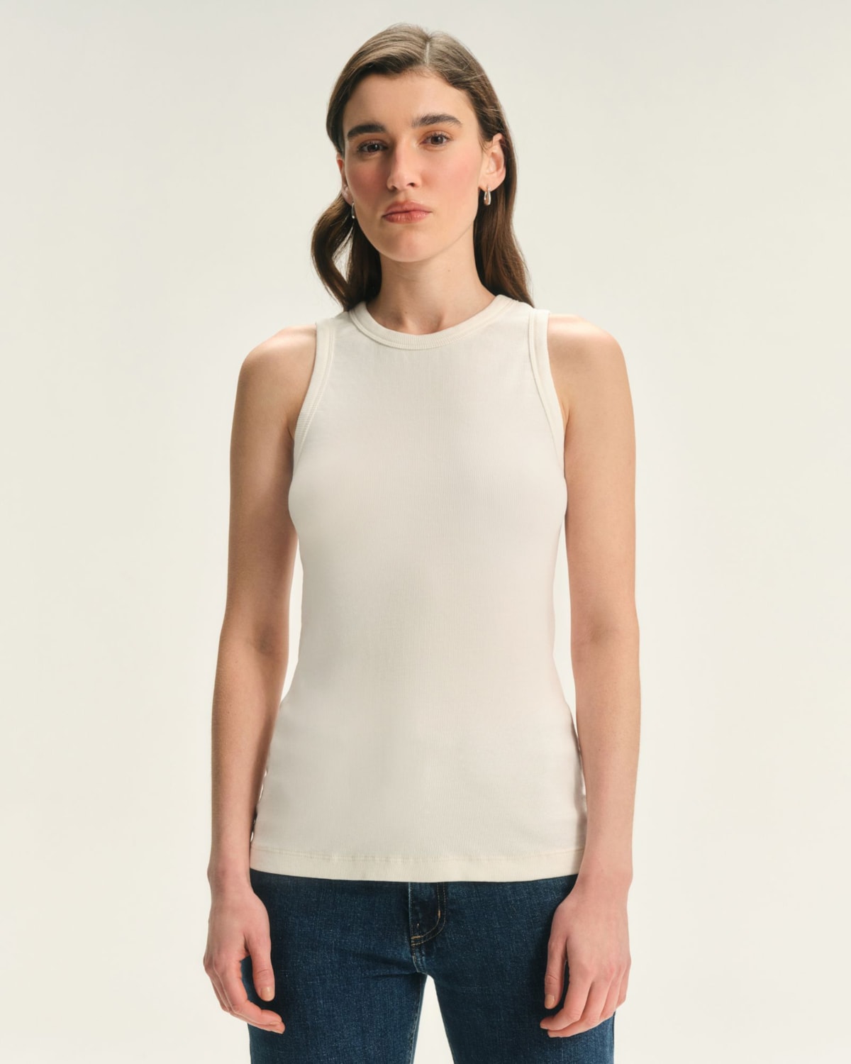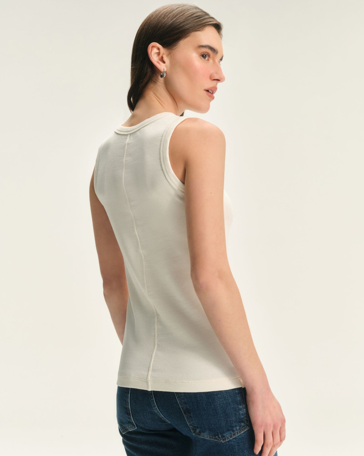 Decote: Decote redondo mais fechado, um design moderno e minimalista que oferece versatilidade. Seu acabamento é reforçado para acompanhar a estrutura da malha canelada.