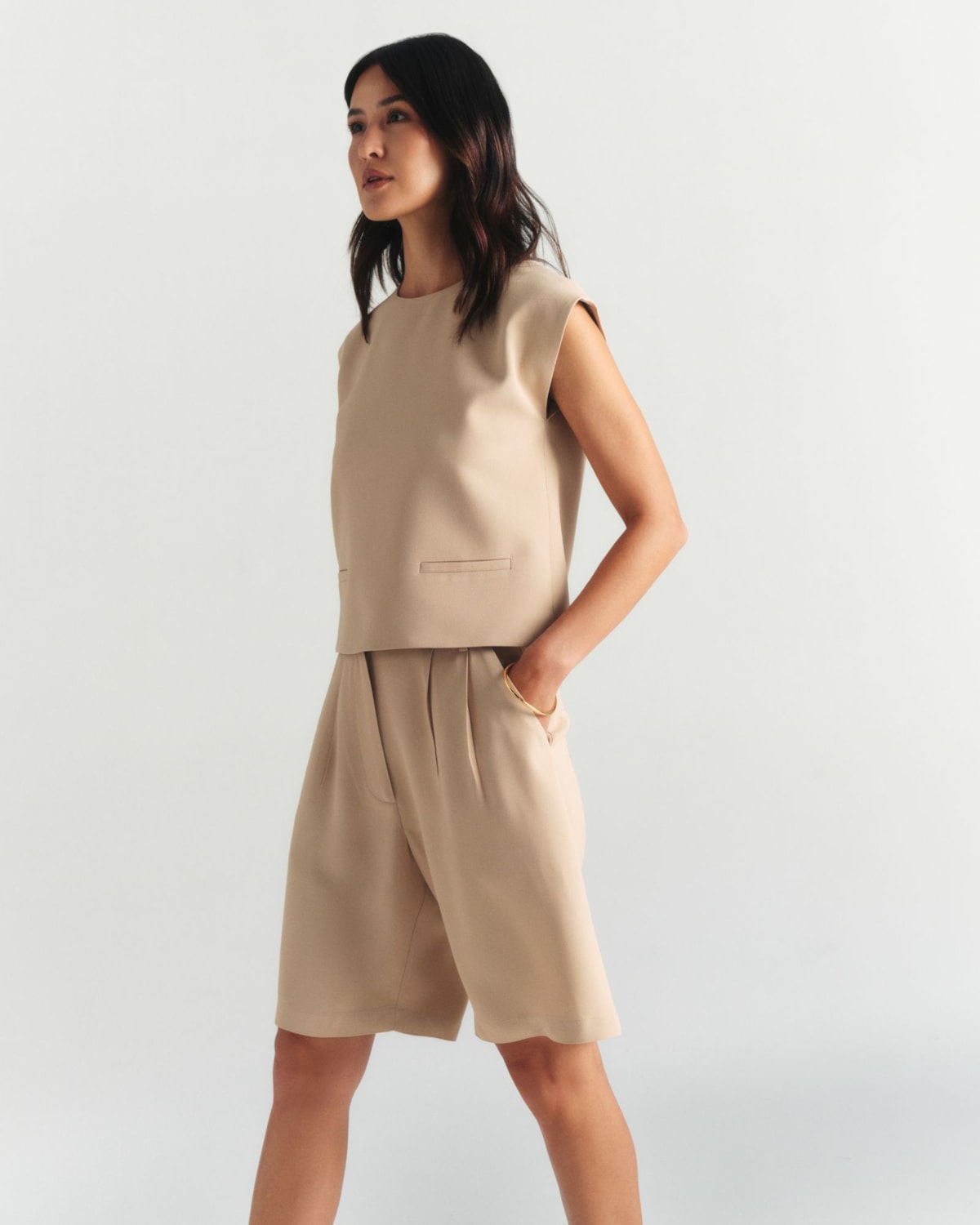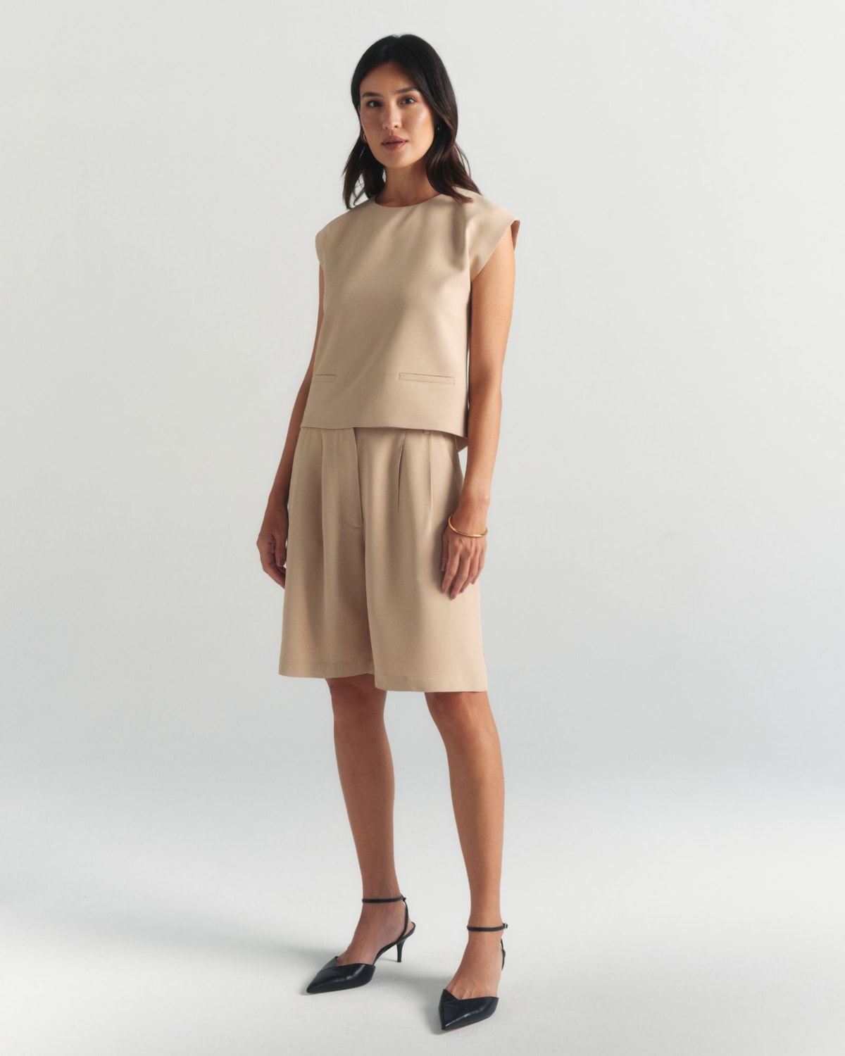 Detalhes de Alfaiataria: Apresenta bolsos frontais alfaiatados que conferem design e estrutura à peça. O fechamento posterior em gota com aselha garante um acabamento delicado e impecável.
