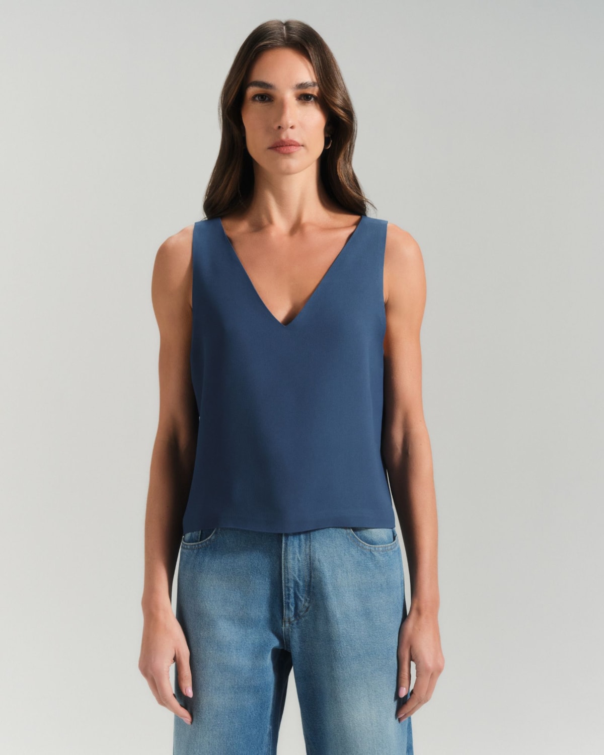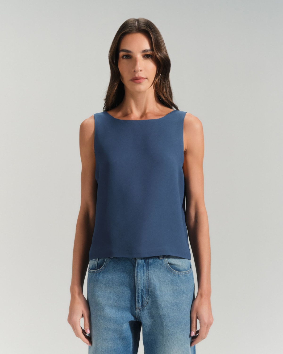Decote Duplo: O grande diferencial da peça é seu decote duplo. De um lado, um decote V clássico que alonga a silhueta; do outro, um decote U (arredondado), versátil e atemporal. Você escolhe qual usar na frente, adaptando a regata ao seu look.