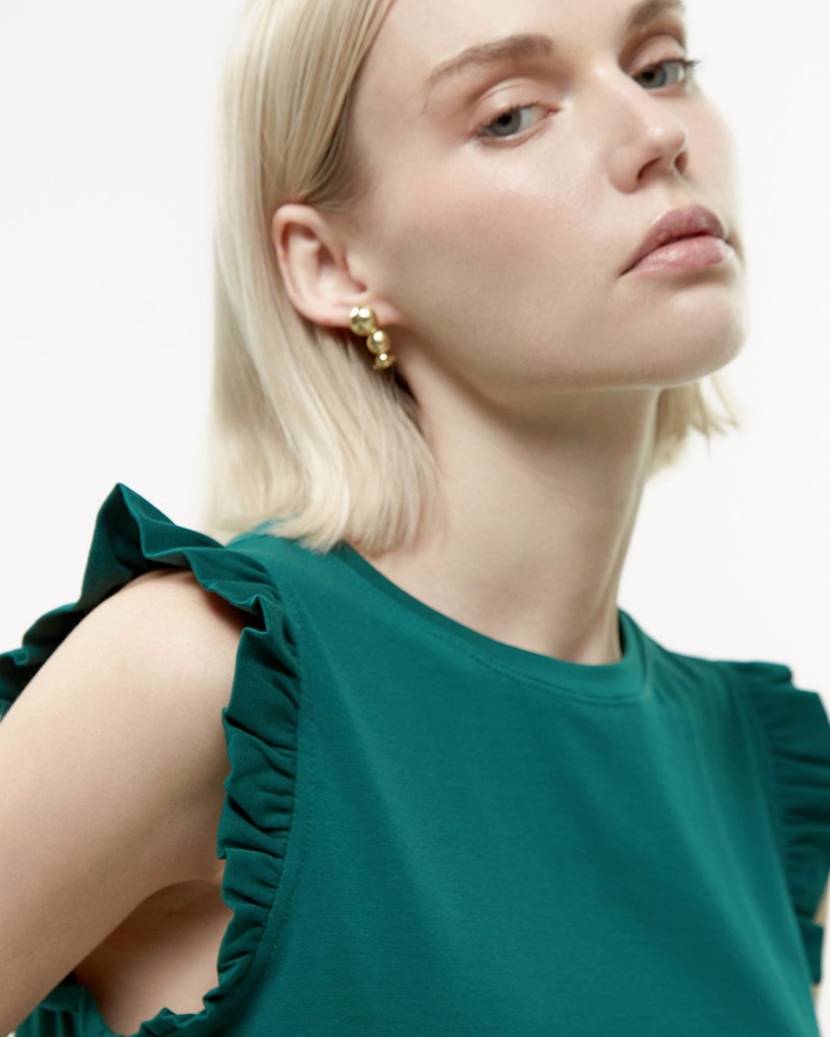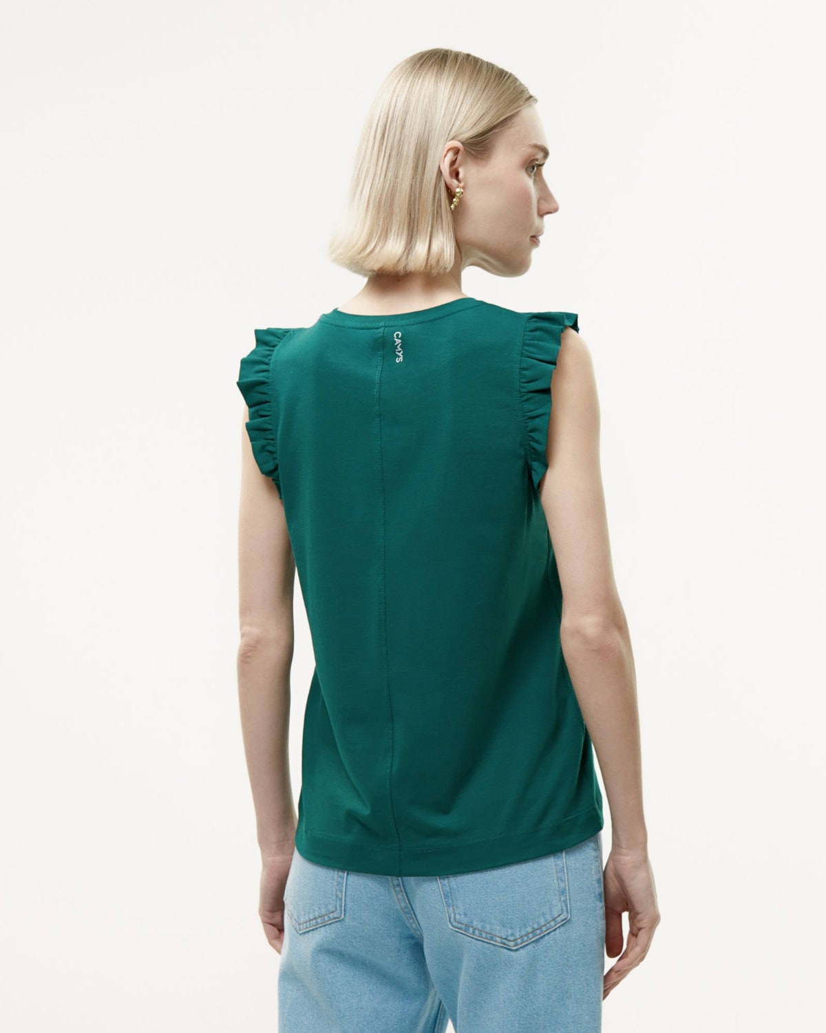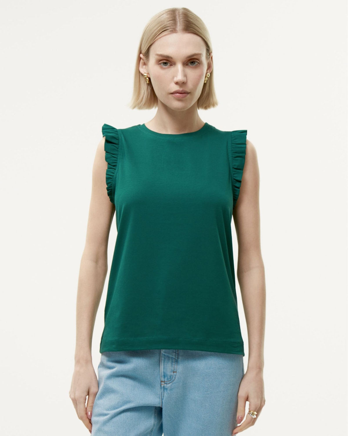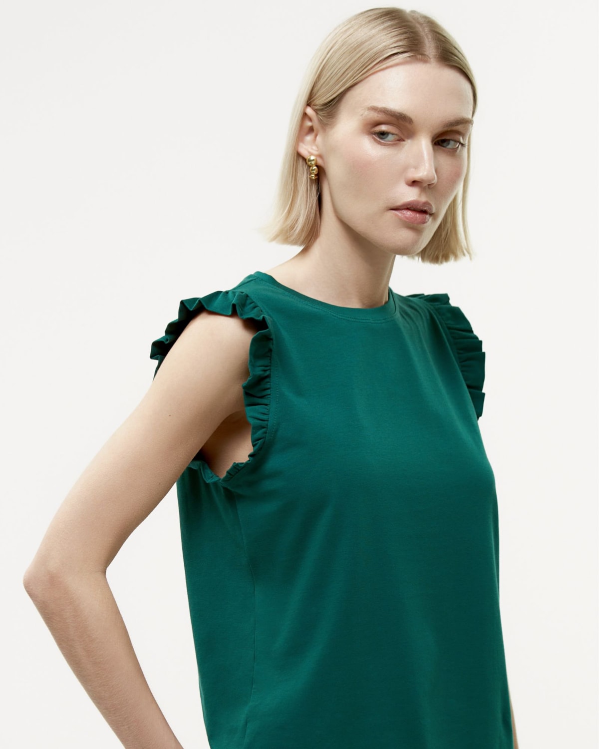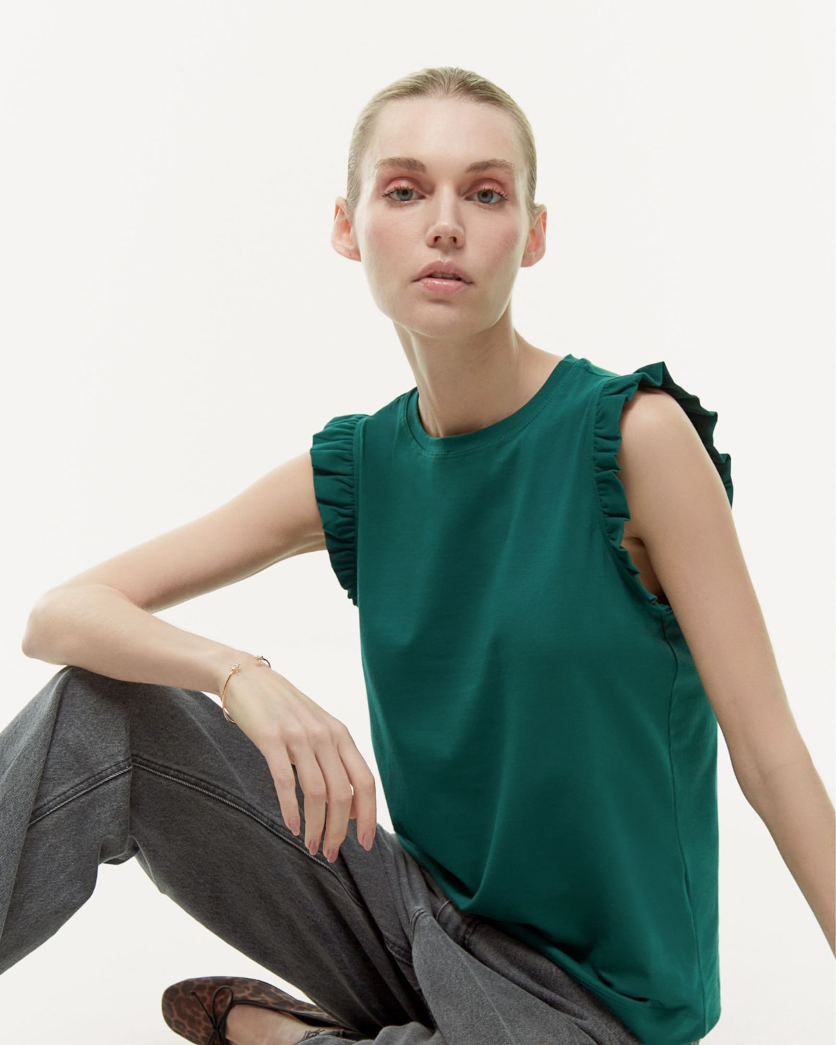 Regata com detalhes de babados nas mangas, deixando a peça romântica.